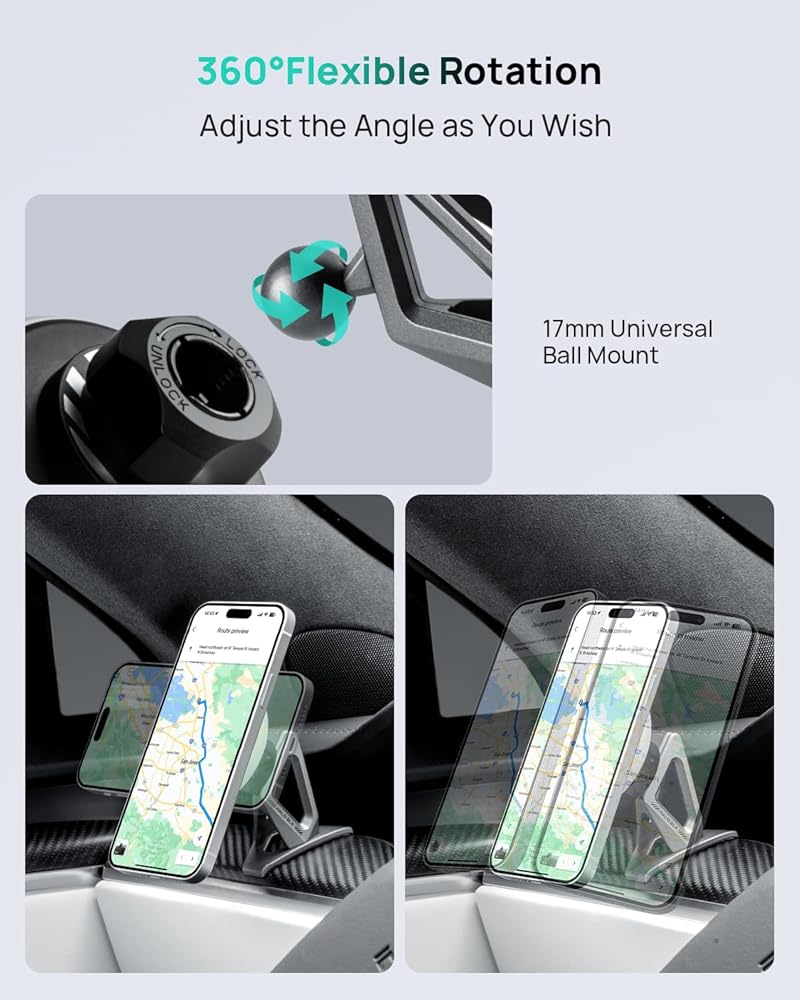 • دوران 360 درجة مع حامل كروي 17 ملم: الشاحن مجهز بحامل كروي 17 ملم، مما يسمح بتدوير هاتفك 360 درجة أثناء عملية الشحن. فهو يلائم تفضيلاتك الفريدة لزاوية المشاهدة المثالية.