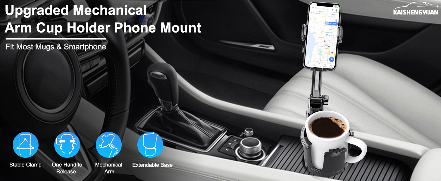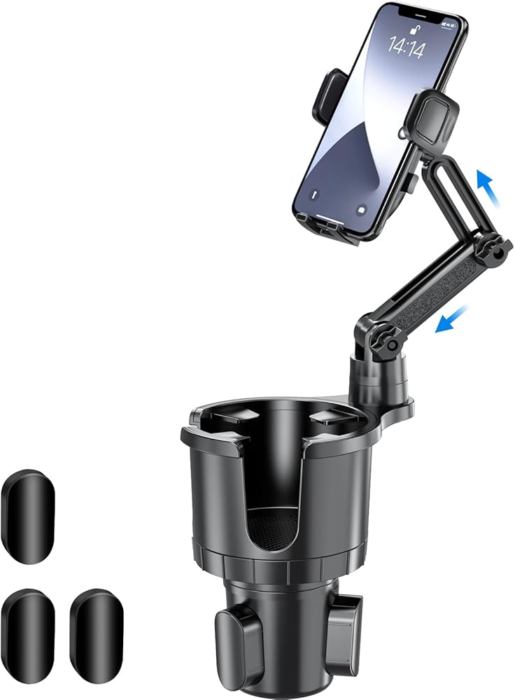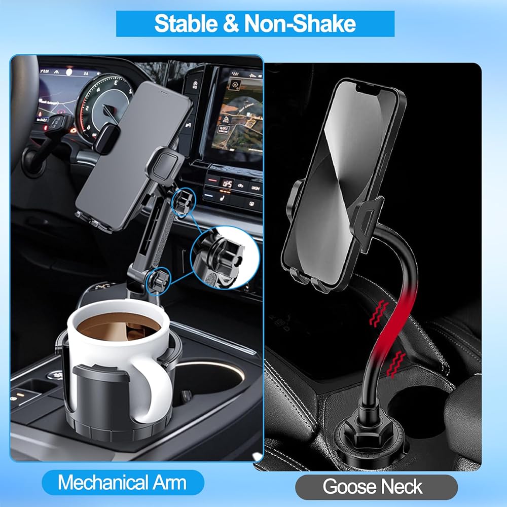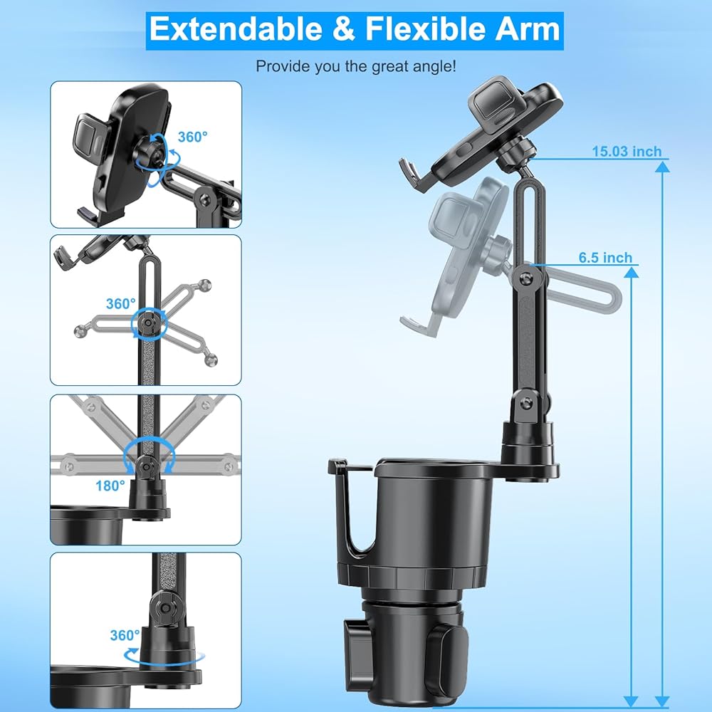 حامل اكواب للسيارة مع حامل جوال 2 في 1 قابل للتعديل مع ذراع ميكانيكي دوار 360 درجة يناسب جميع الهواتف الذكية، محول حامل اكواب عالمي يحمل ما يصل الى 17-40 اونصة