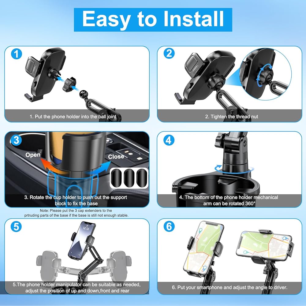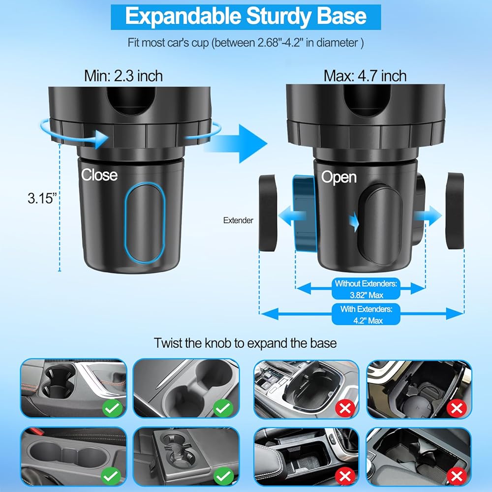 【موسع حامل أكواب السيارة 2 في 1】تصميم 2 في 1 يزيد بذكاء من مساحة تخزين المشروبات، يتم دمج حامل الهاتف بشكل مثالي مع حامل الأكواب، والذي يمكنه استيعاب زجاجة المياه أثناء حمل أي نوع من أنواع الهواتف الخلوية.