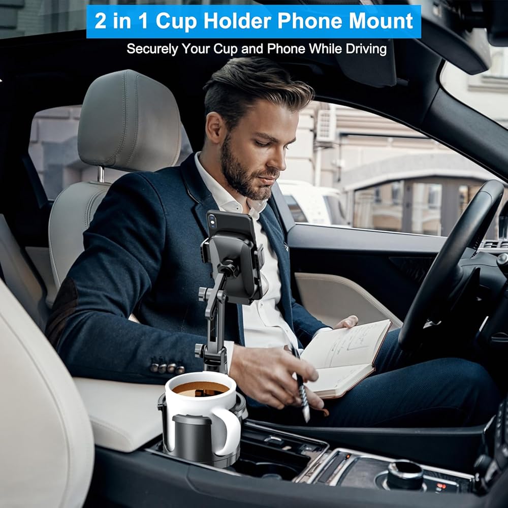 حامل أكواب للسيارة مع حامل هاتف، موسع حامل أكواب قابل للتعديل 2 في 1 مع حامل موبايل دوار 360 درجة يناسب جميع الهواتف الذكية