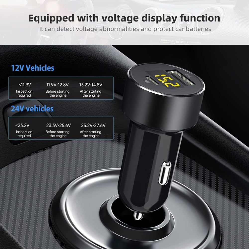 🔌【شاشة LED في الوقت الحقيقي لجهد البطارية】يحتوي على شريحة ذكية للكشف عن الجهد الكهربي، ويمكن لمقبس ولاعة السيجار USB مراقبة جهد بطارية السيارة على الفور وعرضه من خلال مصباح LED. ملاحظة: أثناء الشحن، يتم عرض تيار الإخراج، وعندما لا يتم الشحن، يتم عرض جهد بطارية السيارة.