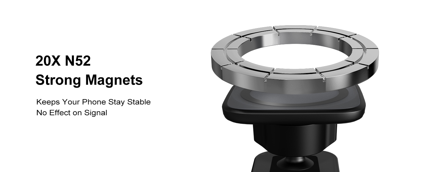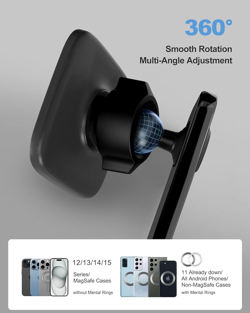 توافق واسع: يمكن أن يتناسب حامل السيارة المغناطيسي بشكل مثالي مع سلسلة MagSafe iPhone 12 و13 و14 و15 وجميع حافظات MagSafe، كما أنه يتمتع بجاذبية مغناطيسية ثابتة. في حالة استخدامه مع طرز هواتف أخرى أو حافظات غير MagSafe، يلزم وجود ملصق الحلقة المعدنية المتضمن للجذب المغناطيسي. [ملاحظة] يوصى بتثبيت الحلقة المعدنية مباشرة على الجزء الخلفي من الهاتف أو داخل علبة الهاتف.
