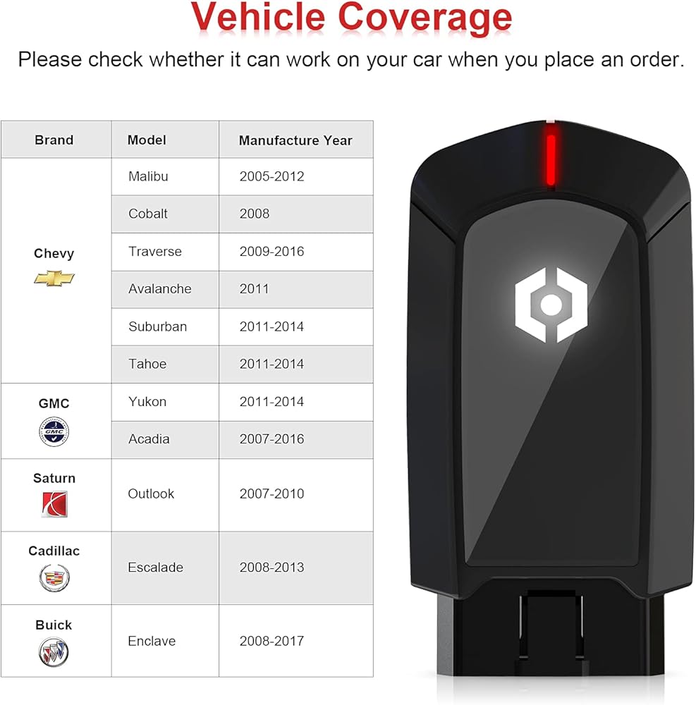 • تغطية المركبات: لسيارة Chevy: Cobalt 2008، أفالانش 2011، Suburban 2011-2014، Tahoe 2011-2014، Malibu 2005-2012، Traverse 2009-2016؛ لـCadillac: Escalade 2008-2013؛ لـGMC: Yukon 2011-2014، أكاديا 2007-2016؛ لساترن: توقعات 2007-2010؛ لبويك: إنكلاف 2008-2017.