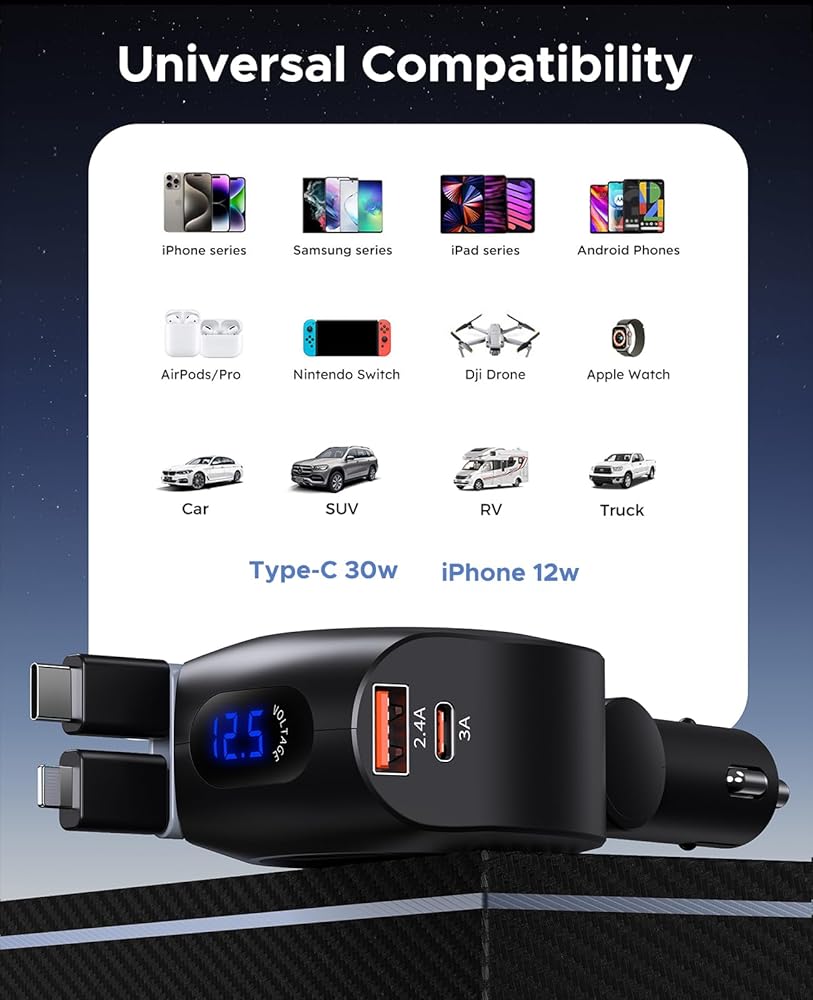 【توافق واسع】يمكن أن يتوافق شاحن سيارة iphone هذا مع iPhone12/12Pro/Max/12Mini/11/11Pro، وSamsung Galaxy S20/S20 Ultra/Note 10/Galaxy S10+، وGoogle Pixel 4 XL/4/3 XL/3/3a/ 3a XL، LG G8 ThinQ/V50، Moto G7 إلخ. مشبك التمديد غير قابل للانزلاق ومقاوم للصدمات. يتم توصيله بقوة، ويمكنه الحفاظ على شحن جيد حتى على الطرق الجبلية الوعرة.