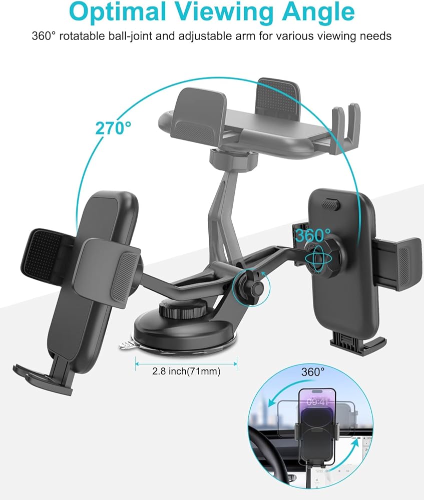 【تعديل مرن】تركيب هاتف السيارة بمفصل كروي مرن 360 درجة، يمكنك ضبط هاتفك الذكي أفقيًا أو رأسيًا. الذراع القابل للتعديل قابل للعكس بمقدار 270 درجة ذهابًا وإيابًا، مما يسمح لك باستخدام الهاتف بسهولة وضمان تجربة قيادة آمنة ومريحة.