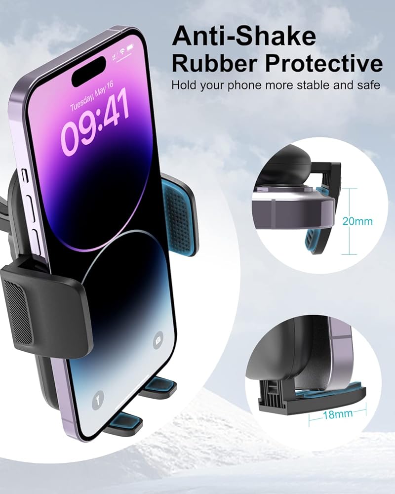 【مشبك واقٍ مطاطي】حامل هاتف للسيارة مزود بوسادة سيليكون مطاطية عالية الكثافة، وإطار دعم صلب ومشبك قوي مقاوم للخدش، يثبت هاتفك المحمول بقوة في مكانه حتى عند السرعات العالية أو المطبات أو المنعطفات.
