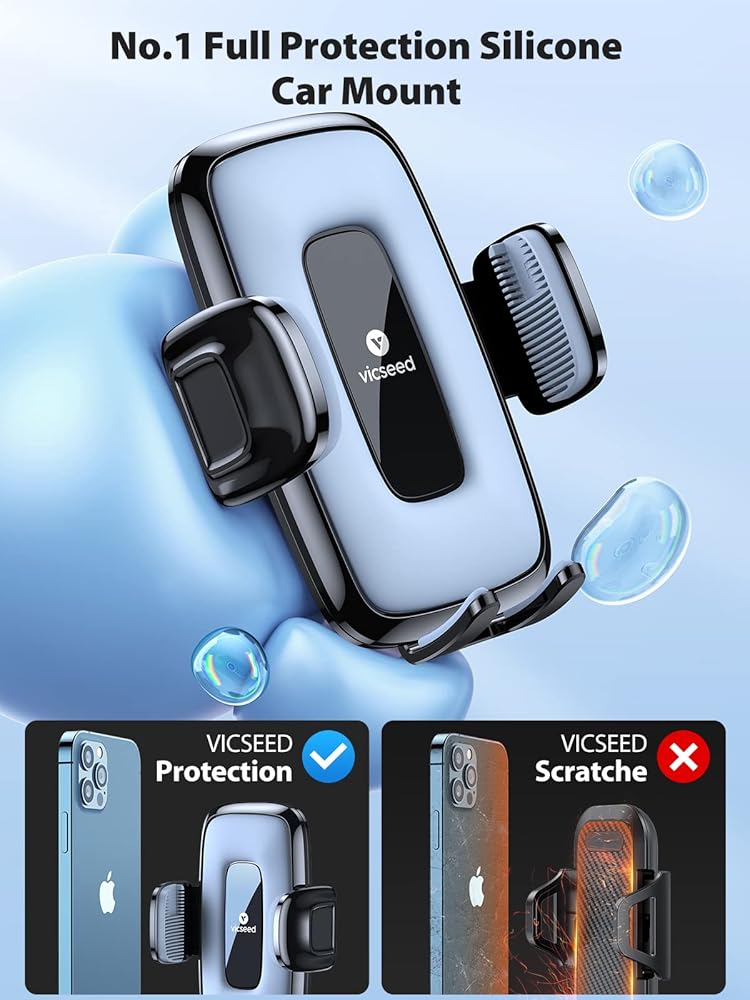 【𝗨𝗹𝘁𝗶𝗺𝗮𝘁𝗲 𝗦𝗶𝗹𝗶𝗰𝗼𝗻𝗲 𝗣𝗿𝗼𝘁𝗲𝗰𝘁𝗶𝗼𝗻】: قل وداعًا لتركيب اللوحة البلاستيكية سهلة الخدش. يضيف حامل الهاتف الخلوي للسيارة VICSEED مادة سيليكون عالية الكثافة ذات مرونة ممتازة. إن حامل الهاتف الخلوي في السيارة مغطى بطبقة سميكة من السيليكون والتي تضمن أن جهازك المحمول آمن من التآكل والتمزق. تصميم غير مسبوق، لا يترك أي خدش على الأجهزة المحمولة.