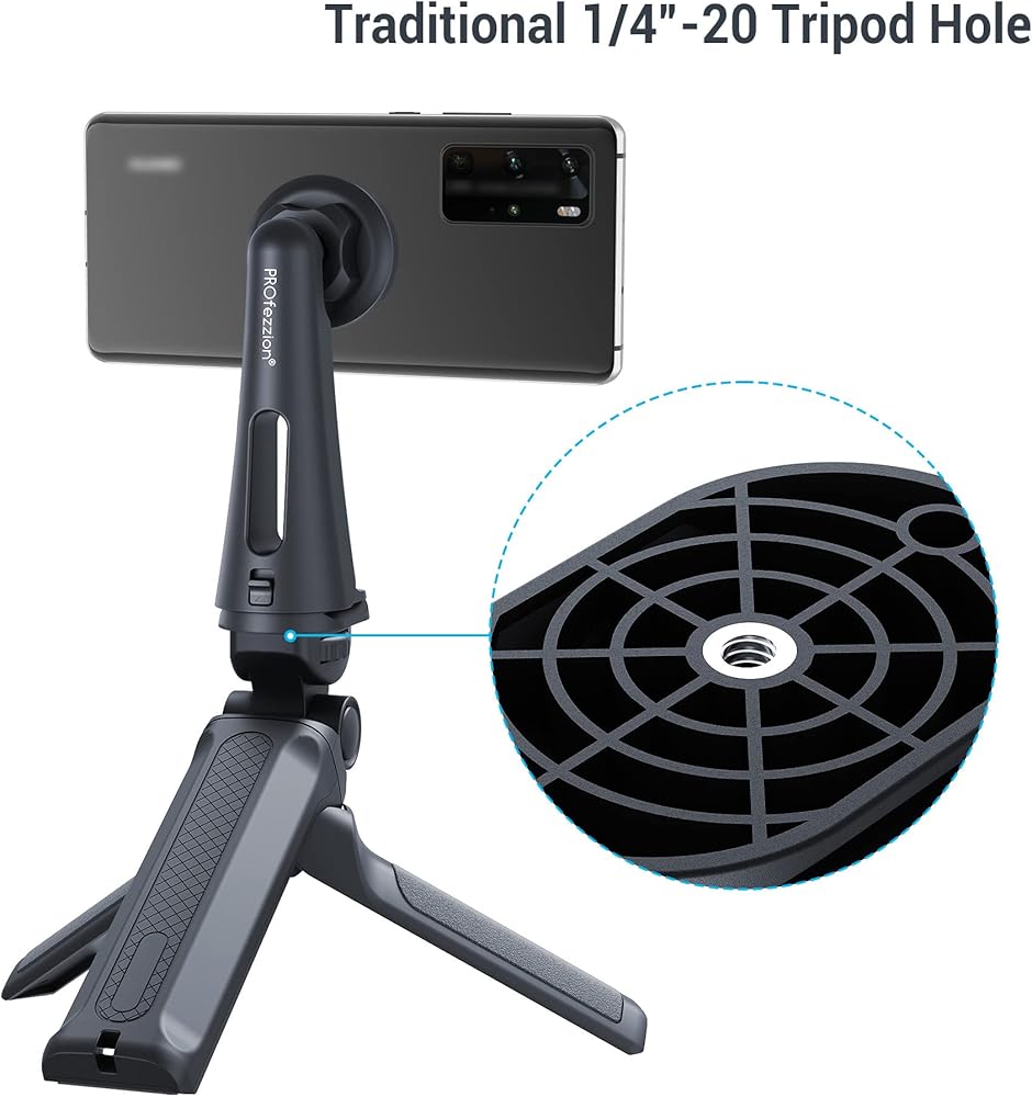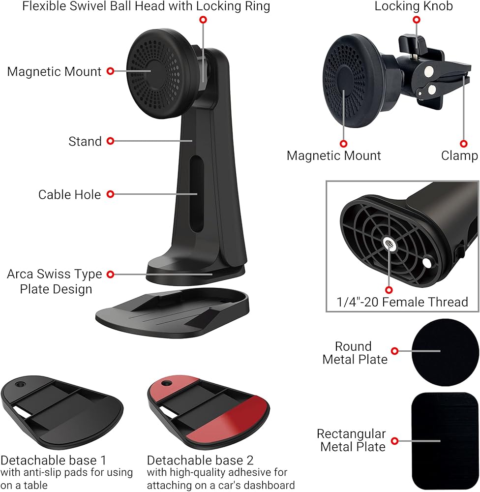 【يستخدم كحامل جوال للحامل الثلاثي】 افصل الحامل عن القاعدة، حيث يتميز الجزء السفلي من الحامل بمنفذ ثلاثي ملولب 1/4 انش - 20 ومنفذ مدمج سريع الفك من نوع اركا سويس، يمكن تركيبه على حامل ثلاثي القوائم أو حامل أحادي مع برغي تقليدي 1/4 انش - 20 أو مشبك اركا سويس سريع الفك. (لا تسبب العبث بالمشابك ذات النمط الزنبركي الشائعة ولا توجد صعوبات في الوصول إلى المفاتيح الجانبية لهاتفك.)