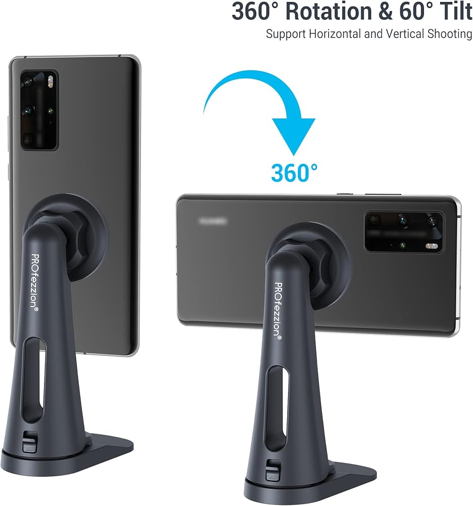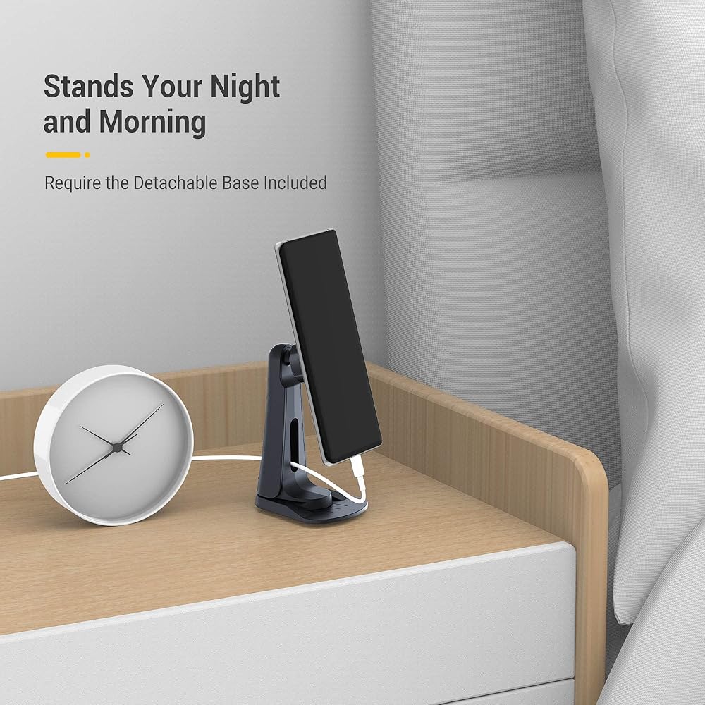 【يستخدم كحامل جوال لسطح المكتب وسطح صلب مسطح】 ضع القاعدة القابلة للفصل ① مع وسادة سيليكون ناعمة في الأسفل إلى مكتبك، ثم حرك الحامل في القاعدة حتى يتم قفله وقم بتثبيت هاتفك مباشرة على الواجهة المغناطيسية على الحامل. (رائعة ورائعة لتحرير يديك، كما تسمح لك بتدوير الهاتف إلى الوضع الأفقي أو الرأسي بلفة بسيطة بيد واحدة.)
