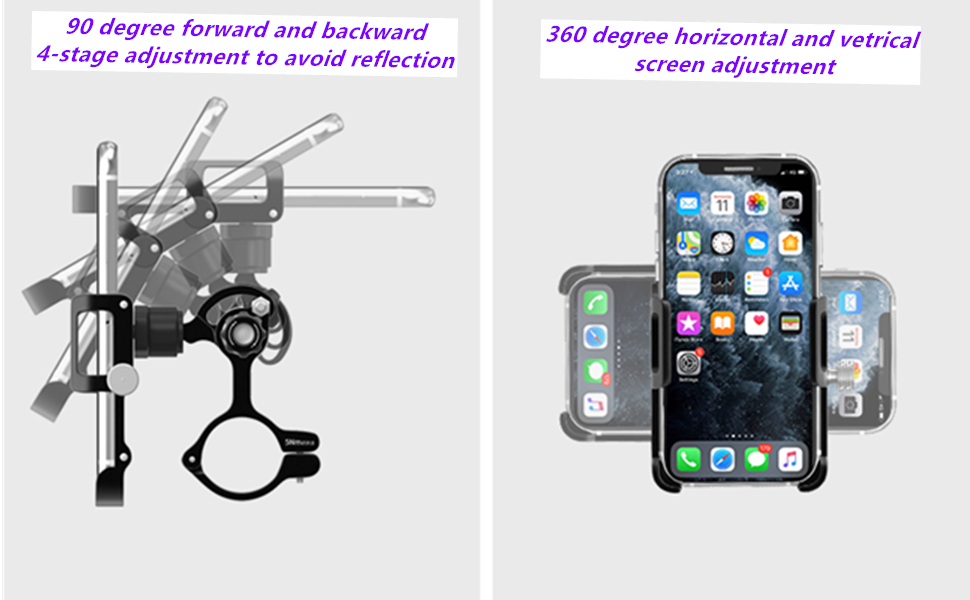يتيح لك الدوران 360 درجة والإمالة 90 درجة عرض شاشة هاتفك من أي زاوية. سهل التركيب على مقود 31.8 ملم/25.4 ملم/22.2 ملم، مريح جدًا لركوب الدراجات النارية والدراجات النارية. يمكن استخدامه على الجبل/الطريق/الدراجة القابلة للطي والدراجات النارية والسكوتر وما إلى ذلك.