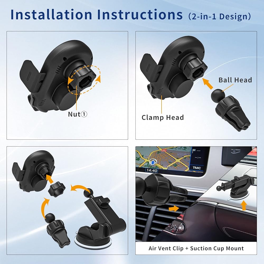 【تركيب بسيط وموثوق】يمكن تركيب شاحن السيارة اللاسلكي سوبرنايت الخاص بنا على الزجاج الأمامي ولوحة القيادة وفتحة التهوية والطاولة وما إلى ذلك. يسمح الدوران بزاوية 360 درجة برؤية مثالية واستخدام أسهل للوظائف، مما يضمن الطريقة الأكثر أمانًا للوصول إلى أنظمة الهواتف الخاصة بك مثل نظام تحديد المواقع العالمي والمكالمات الهاتفية أثناء القيادة.