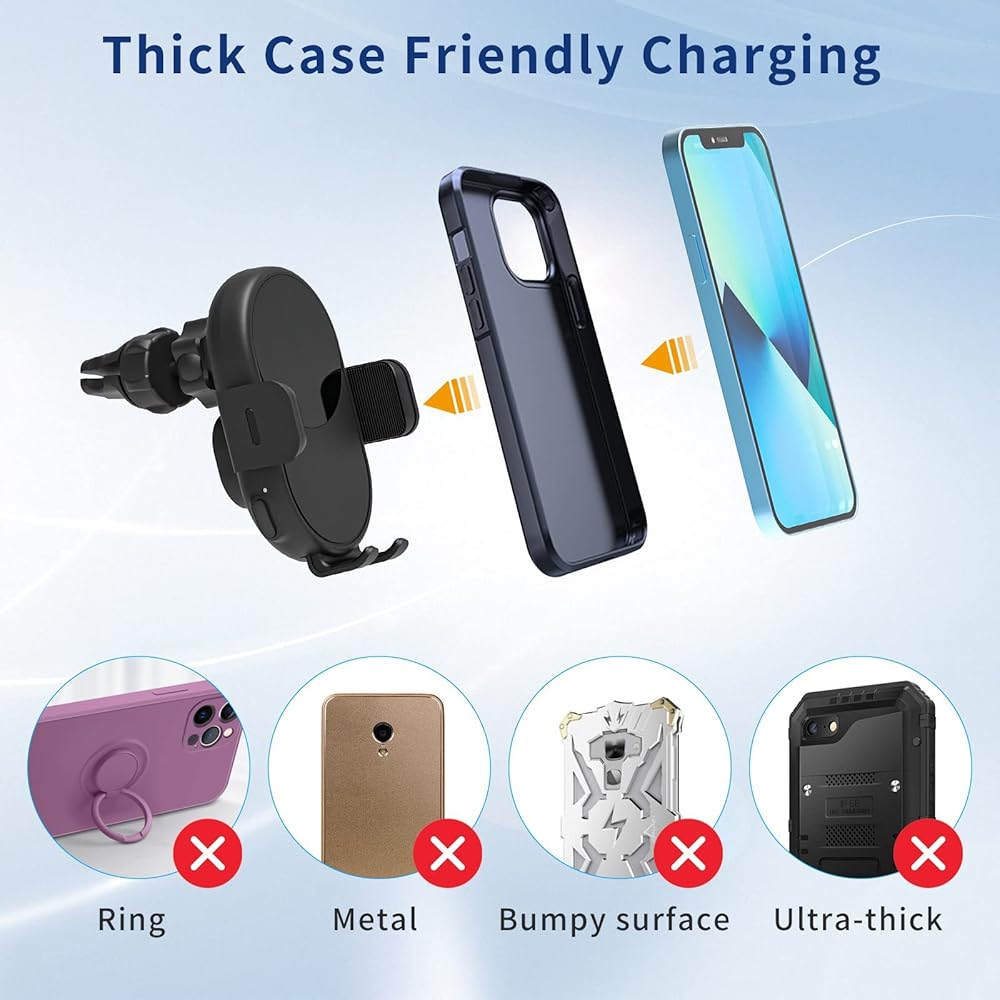 【تصميم 2 في 1】يجمع بين الشاحن اللاسلكي كيو اي وحامل هاتف السيارة، مما يسمح بتجربة شحن آمنة داخل السيارة. عندما يكون في وضع الشحن، سيضيء مؤشر LED الأزرق. لا حاجة لخلع جراب الموبايل ولكن تذكر إزالة الأجسام المعدنية والمغناطيسية أثناء الشحن.