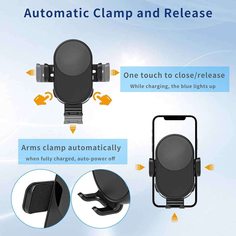 【التعرف التلقائي】اضغط على الزر الجانبي، وستفتح الأذرع تلقائيًا. سيقوم شاحن الهاتف اللاسلكي بالتثبيت والشحن تلقائيًا بمجرد وضع الهاتف في الحامل. أحدث شريحة ذكية مدمجة يمكنها تحديد قوة شحن الجهاز تلقائيًا لتحسين تأثير الشحن. حوامل شاحن السيارة اللاسلكية الخاصة بنا معتمدة من UL وFCC وCE وROHS. عندما يكون هاتفك مشحونًا بالكامل، سيتوقف شاحن السيارة اللاسلكي الذكي هذا تلقائيًا ويحمي البطارية.