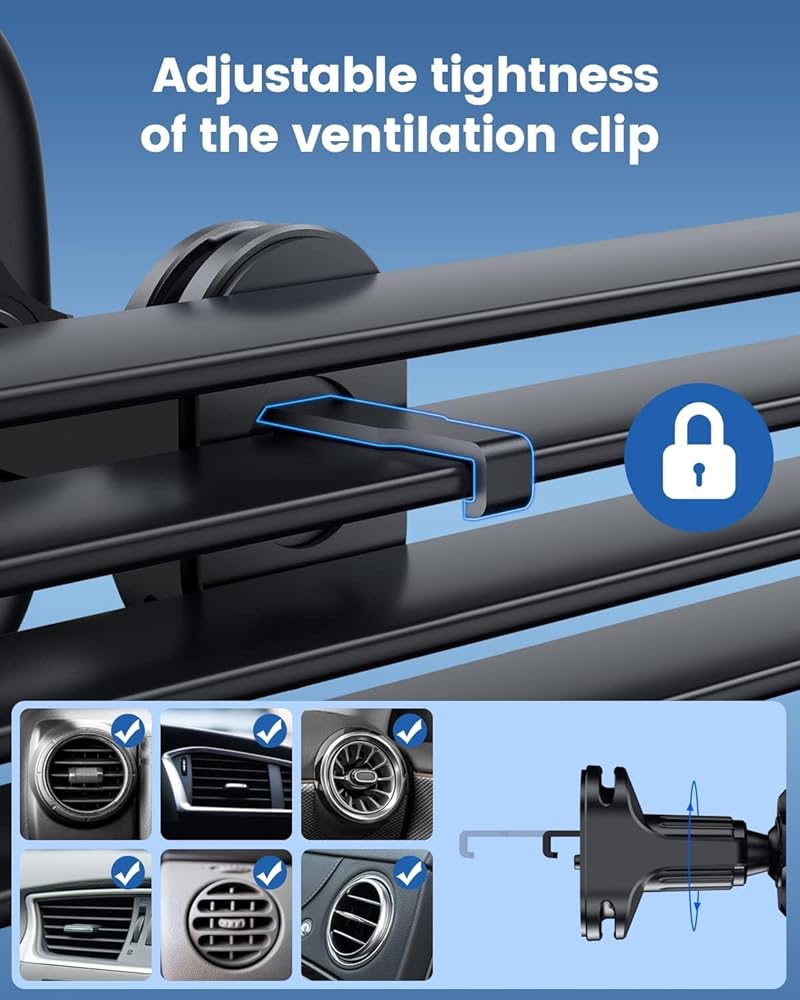 【مشبك فتحة التهوية المطور لعام 2022】 بعد تحليل الآلاف من حوامل السيارات في السوق، مشبك سيارة مثبت على فتحة التهوية مصمم حديثًا، يمكنك بسهولة تثبيت حامل السيارة المغناطيسي على فتحة تهوية السيارة، وهو ثابت للغاية وغير قابل للانزلاق ومناسب لمعظم السيارات