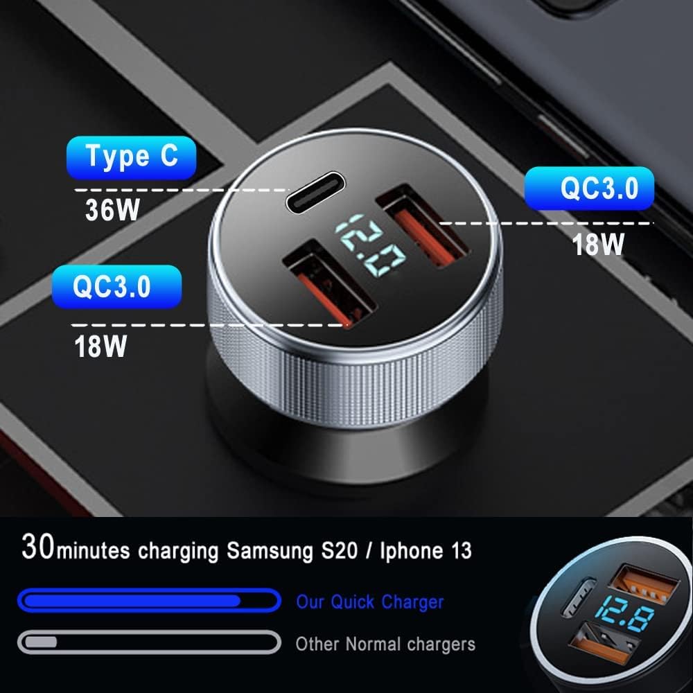 شاحن سيارة USB C 72 واط، 3 منافذ 12 فولت شاحن USB مزدوج QC3.0 و36 واط PD معدني صغير سريع محول شاحن سيارة مع الفولتميتر LED للمركبات 12 فولت ~ 24 فولت (فضي)