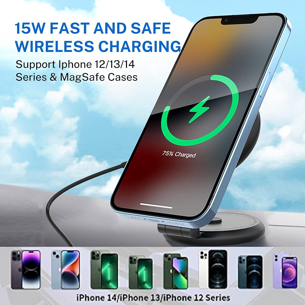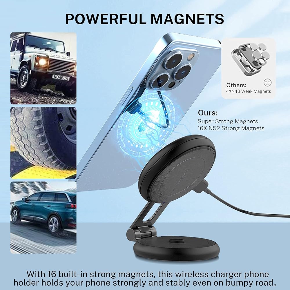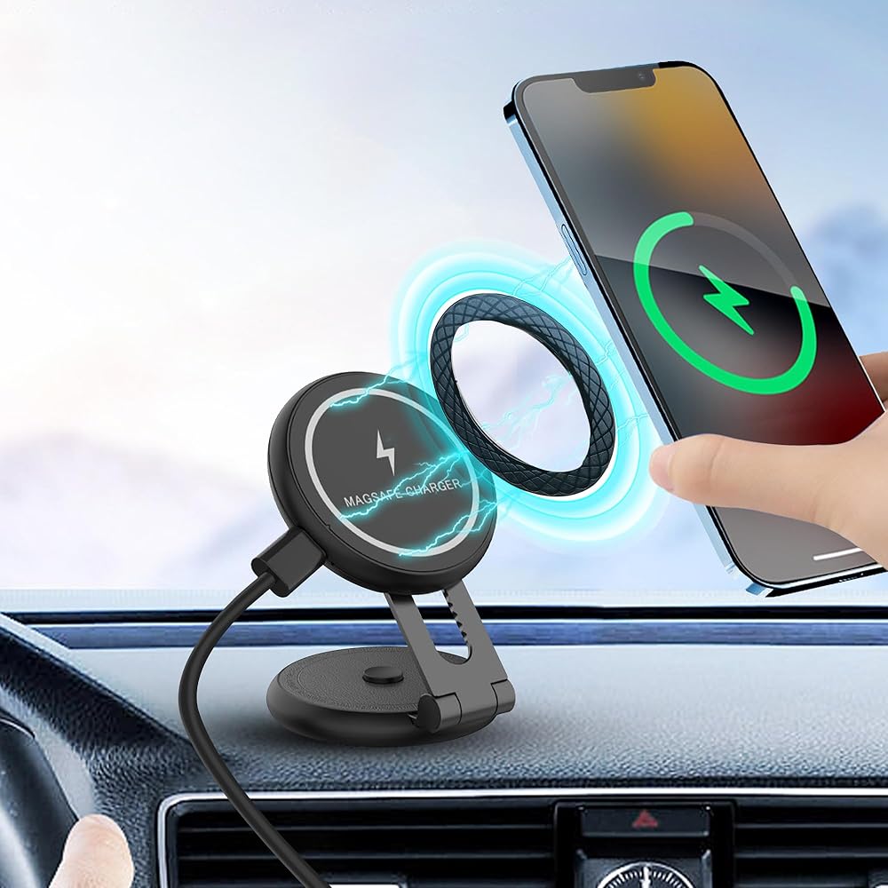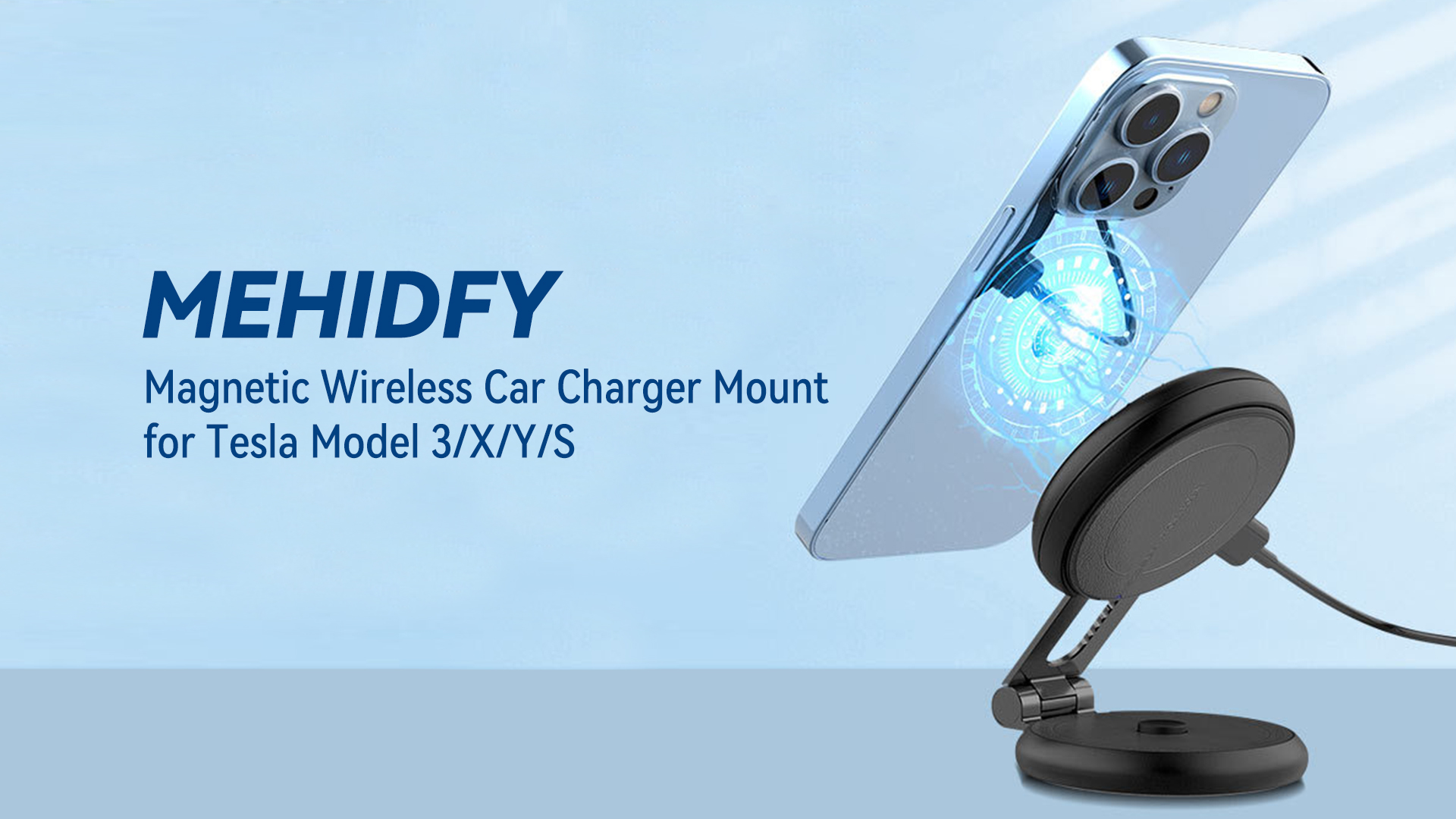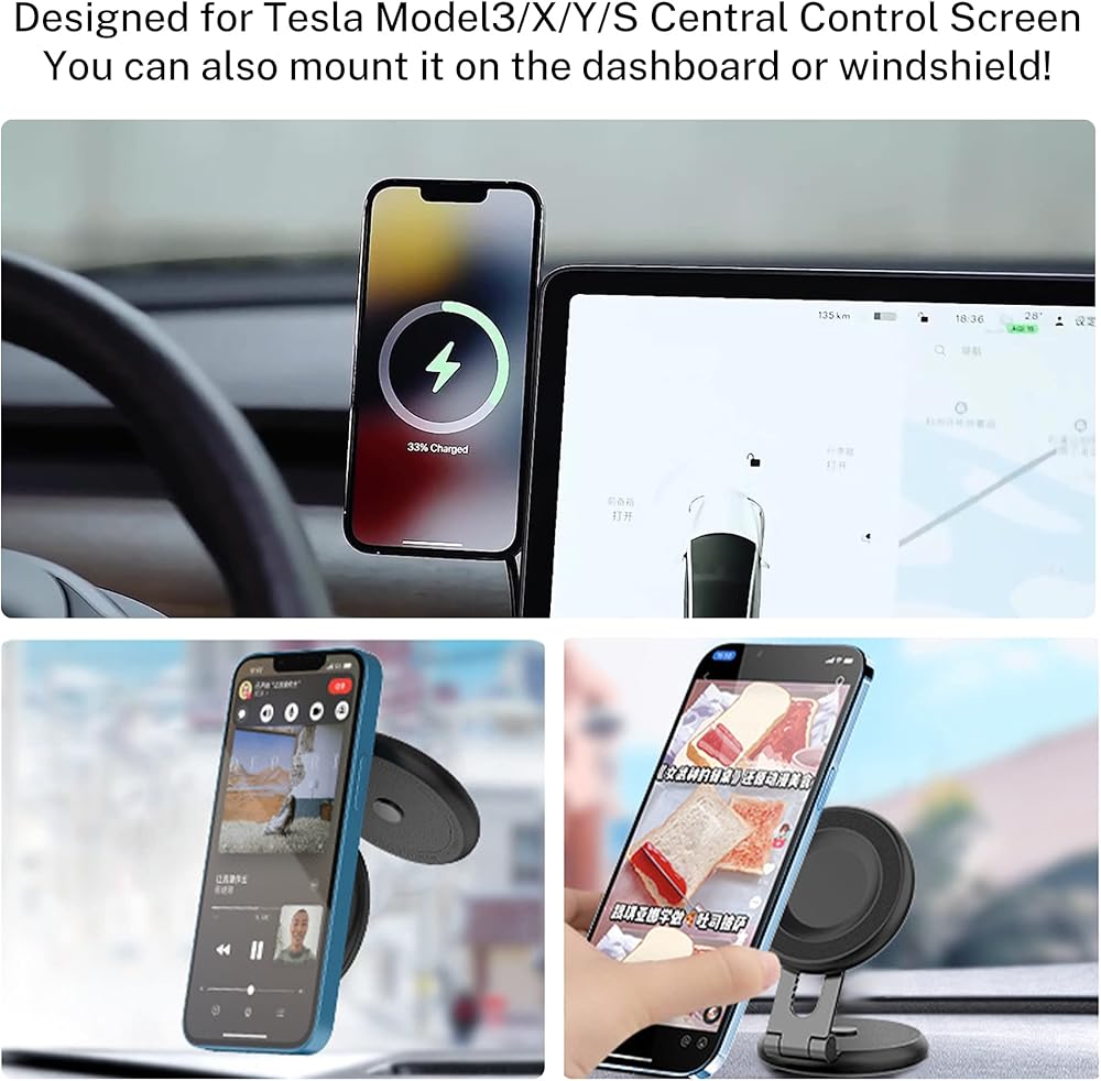 حامل شاحن سيارة لاسلكي مغناطيسي قابل للطي من ميهيدي، حامل جوال مغناطيسي سريع الشحن بقدرة 15 واط لسيارة تيسلا موديل 3/X/Y/S، متوافق مع حافظة ماج سيف وايفون 12/13/14 برو ماكس ميني، دوران 360 درجة