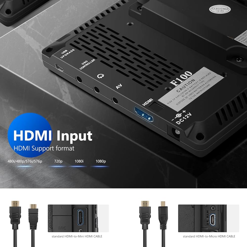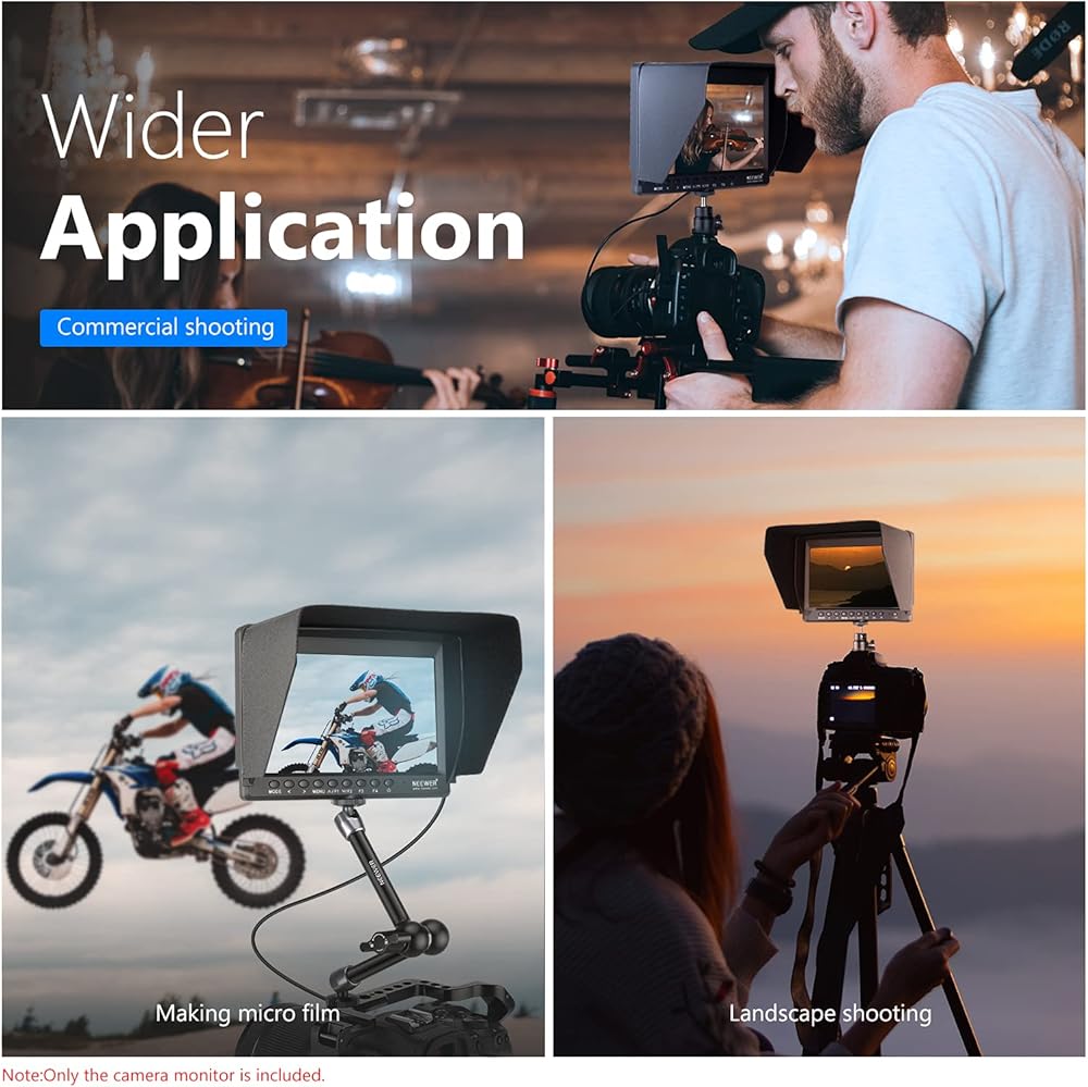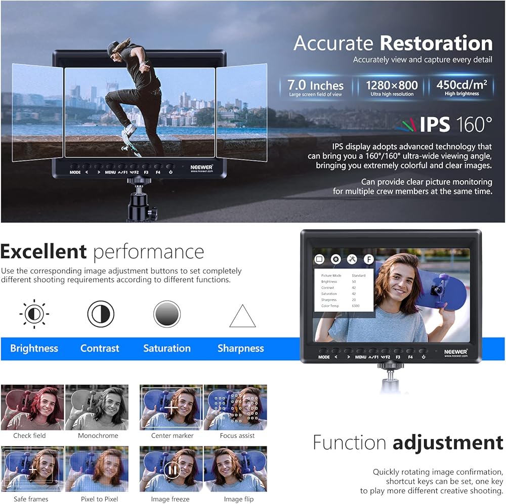 【شاشة مجال خارجية】 تتميز بلوحة IPS بزاوية رؤية عريضة 7 انش وتصميم رفيع للغاية 17 ملم مع إضاءة خلفية LED، دقة HD 1280 × 800، وسطوع 450 شمعة لكل متر مربع، ونسبة تباين 1200:1، ونسبة امتداد 16:10، هذه الشاشة مفيدة لتصوير الفيديو.