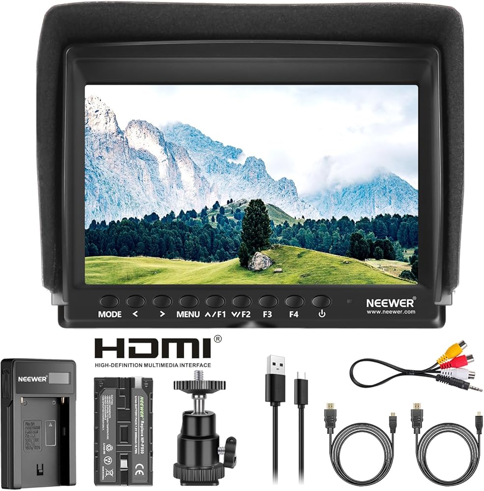 【محتويات العبوة】 شاشة ميدانية F100 من نيوير، كيبل HDMI صغير، كيبل مايكرو HDMI، مظلة شمسية، رأس كروي صغير، كيبل ايه في، بطارية ليثيوم ايون NP-F550 2600mAh قابلة لإعادة الشحن، شاحن بطارية USB NP-F550، دليل المستخدم
