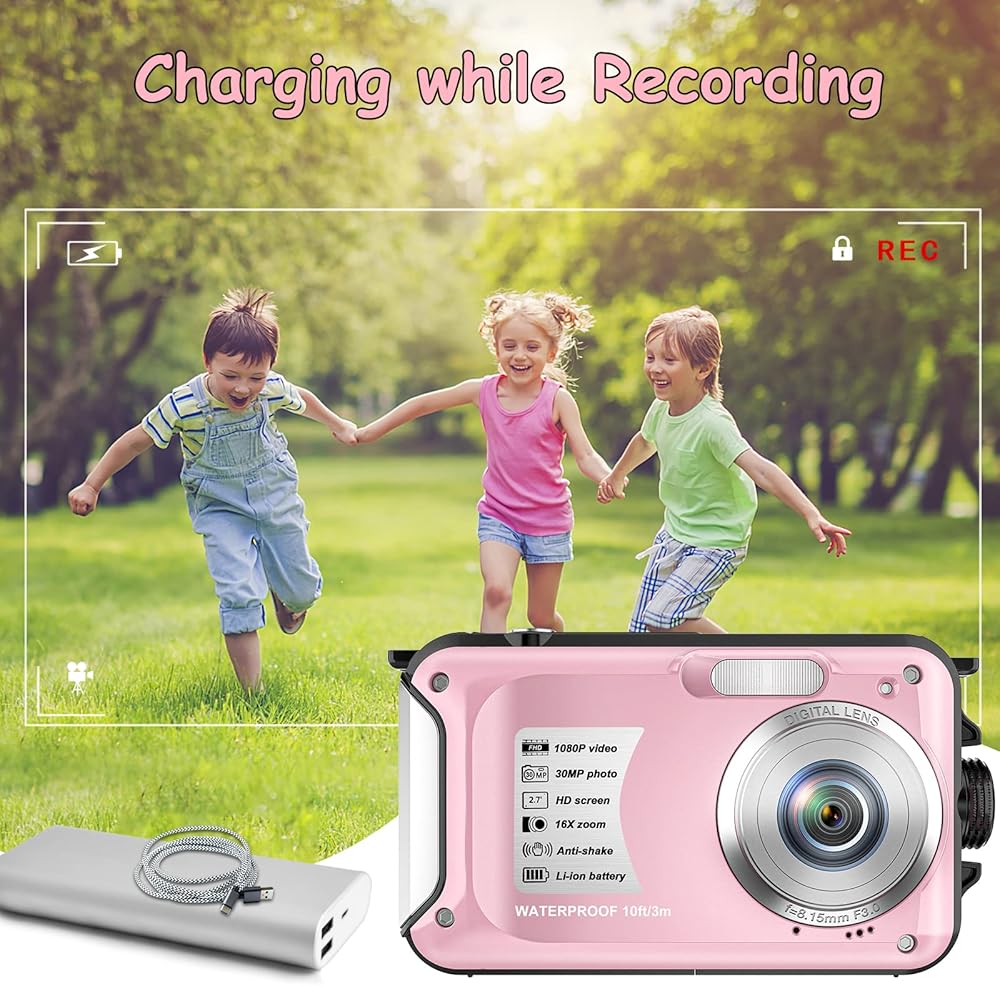 كاميرا تحت الماء بوينت اند شوت مقاومة للماء مع بطاقة 32 جيجا بايت 10FT 30MP 1080P FHD فيديو مدمج محمول 16X تكبير كاميرا رقمية مقاومة للماء للأطفال، وردي