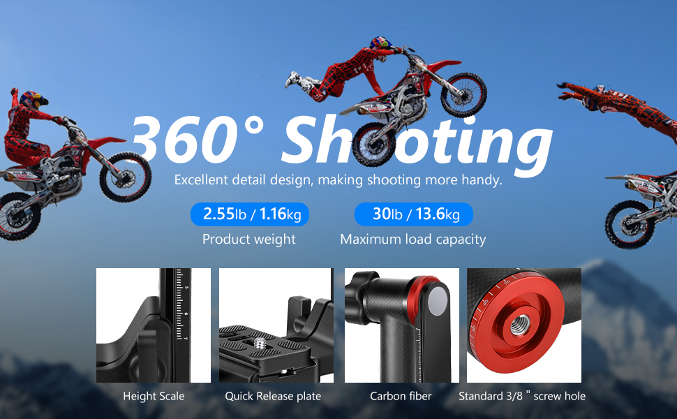 【اتجاهات عمودية وأفقية】 يتيح لك الذراع المتأرجح التصوير عموديًا وأفقيًا. يسمح لك الميزان بوضع منصة لوحة الفك السريع على ارتفاعات مختلفة. قم بشد مقبض قفل الذراع المتأرجح للحصول على وضع ثابت للكاميرا