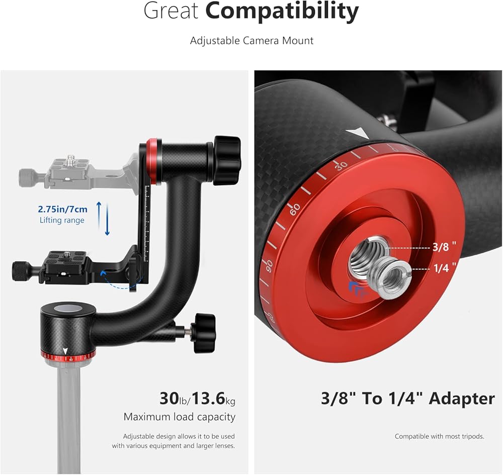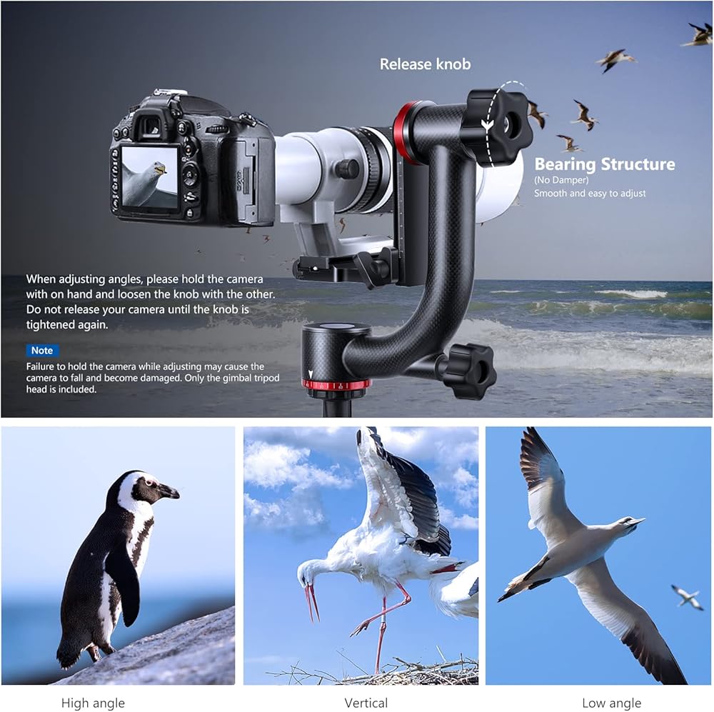 【حركة سلسة للكاميرا】 يوازن رأس الحامل ثلاثي القوائم جيمبال الكاميرا على المحاور الرأسية والأفقية ويسمح لك بتدوير الكاميرا وتدويرها بدقة عالية. مع محامل مدمجة، يصبح أكثر سلاسة وأسهل في التعديل. مثالية لمشاهدة الطيور والمصورين الذين يرغبون في التقاط صور واضحة لأهداف سريعة الحركة في الحياة البرية والتصوير الرياضي
