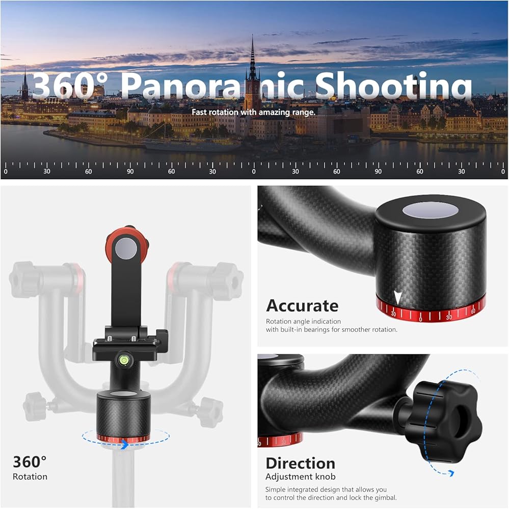 【قاعدة دوران 360 درجة】 تتيح لك قاعدة الدوران مع الميزان تدوير الكاميرا بدقة بزاوية 360 درجة للحصول على لقطات بانورامية. يساعدك مقبض القفل على تثبيت قاعدة التحريك في مكانها. تسمح لك المقابس 1/4 انش و3/8 انش في الأسفل بتركيب الرأس على معظم الحوامل الثلاثية