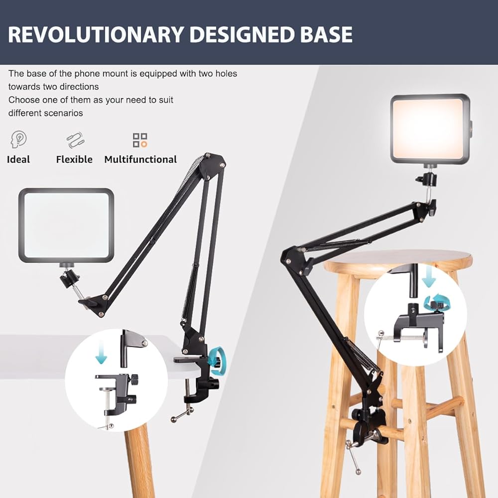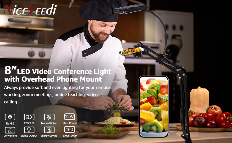 حامل هاتف علوي مع ضوء فيديو LED مقاس 8 بوصات، حامل ذراع هاتف مفصلي من NiceVeedi مع ضوء مؤتمر فيديو قابل للتعتيم 2800K-6500K، حامل ثلاثي القوائم بجانب السرير للمكتب/السرير لتسجيل الفيديو المباشر ومكالمة تكبير