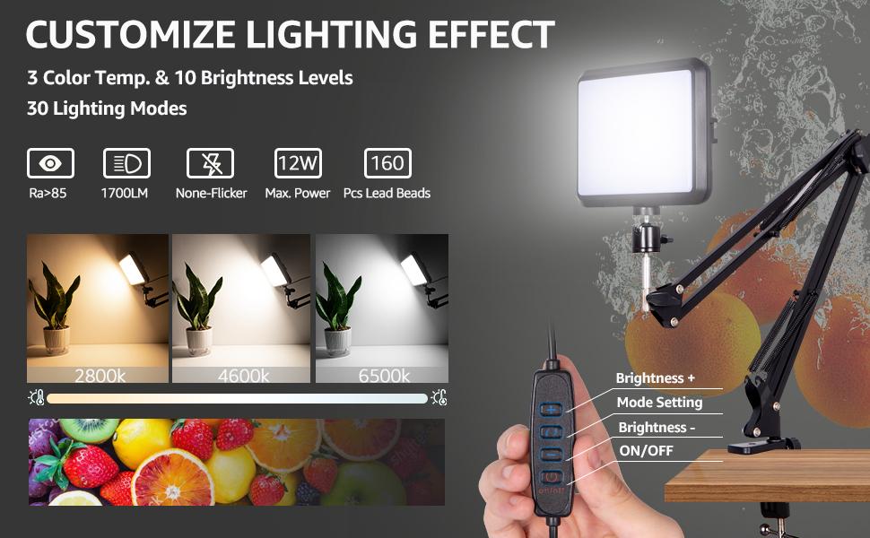 【إضاءة مثالية دائمًا】يتميز مصباح الفيديو هذا بـ 3 درجات حرارة ألوان (2800 كلفن، 4600 كلفن، 6500 كلفن) و10 مستويات سطوع (0-100%) مما يساعد على الحصول على إضاءة مخصصة مثالية. 160 خرزة LED مدمجة مع غلاف ناشر تجعل الإضاءة أكثر تجانسًا ونعومة. إن CRI العالي الذي يبلغ 85+ مخصص لعرض الألوان بدقة. نقدم لك تأثير الإضاءة المثالي لجميع أعمالك.