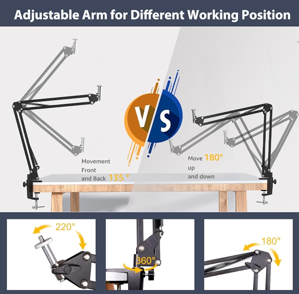【حامل ذراع هاتف مفصلي مرن】يمكن تعديل حامل ذراع الهاتف المفصلي بمرونة مما يسمح لك بالحصول على أي زاوية حسب الحاجة. يعتمد الفولاذ عالي الجودة، مما يجعل الهيكل بأكمله صلبًا ومستقرًا. مع ذراع المشبك الإضافي الإضافي، يمكنك تعديل زاوية الإضاءة وفقًا لمتطلباتك.