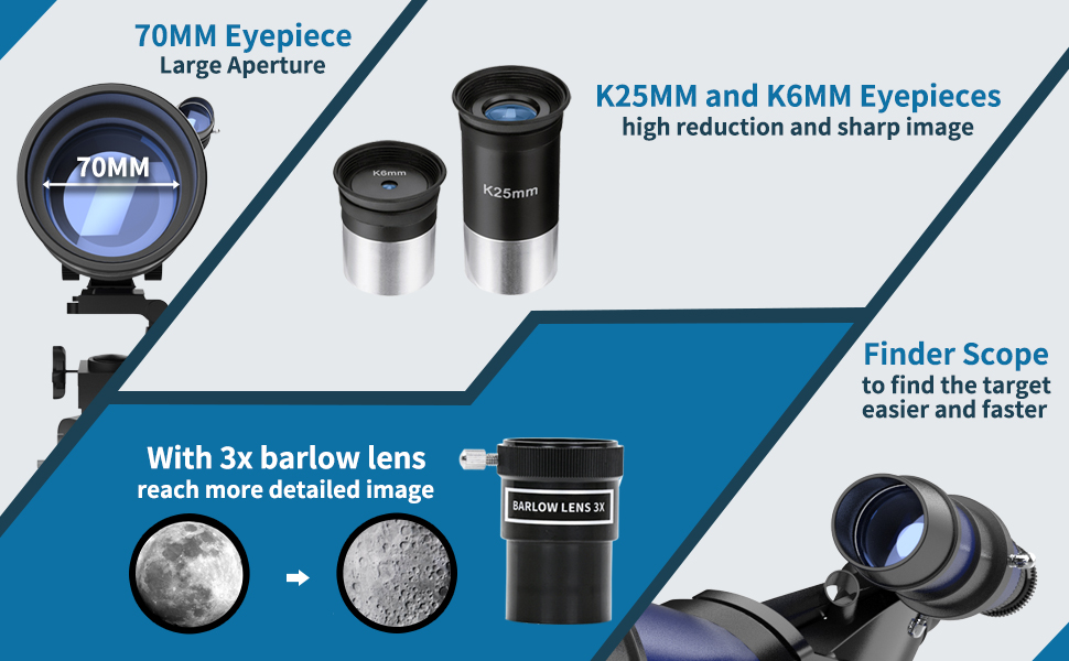 بصريات عالية الجودة: تتميز التلسكوبات الفلكية بفتحة كبيرة جدًا 70 ملم وطول بؤري 400 ملم، مما يوفر مناظر مذهلة للأطفال والكبار المبتدئين.