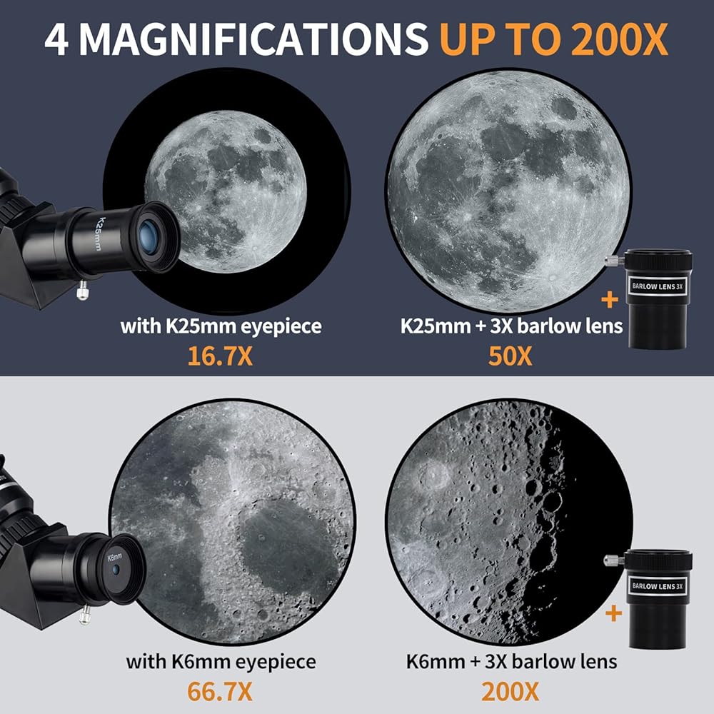 الملحقات الكاملة: تأتي مع محول هاتف، حقيبة حمل، فلاتر قمر، عدسة بارلو، منظار مكتشف إلخ. كل ما تحتاجه للبدء به.