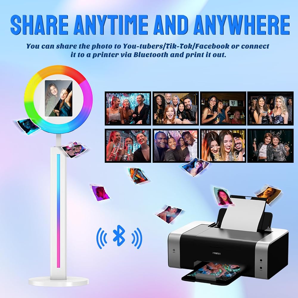 كشك صور iPad لجهاز Ipad مقاس 10.2 بوصة و10.9 بوصة و12.9 بوصة، كشك صور محمول مع مزامنة موسيقى RGB، تطبيق برمجي، جهاز تحكم عن بعد، ضوء حلقي، كشك صور سيلفي مع حقيبة طيران بيضاء