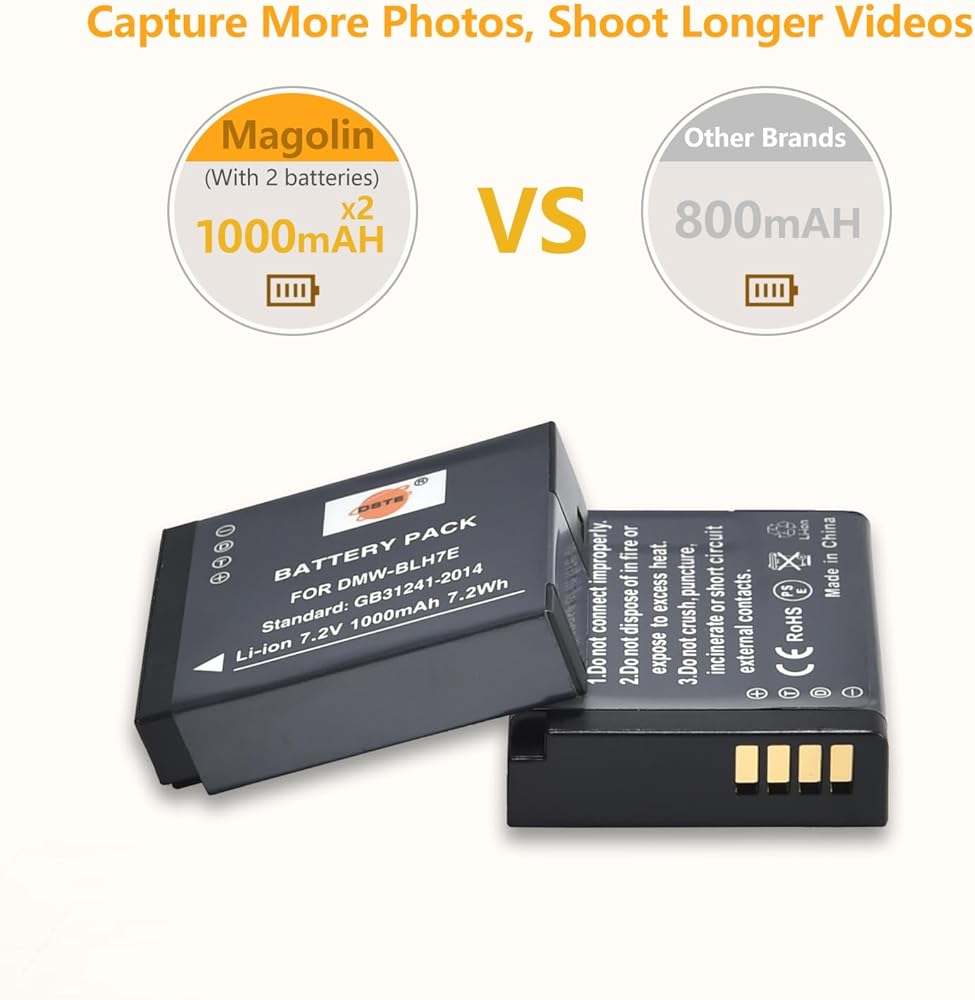 【سعة بطارية قوية】 تعمل الخلايا المتميزة على إنشاء بطاريات عالية الجودة. يمكن لبطارية DMW-BLH7E توفير المزيد من الطاقة لمزيد من اللقطات وتسجيل الفيديو لفترة أطول بناءً على سعة البطارية 7.2 فولت و1000 مللي أمبير في الساعة.