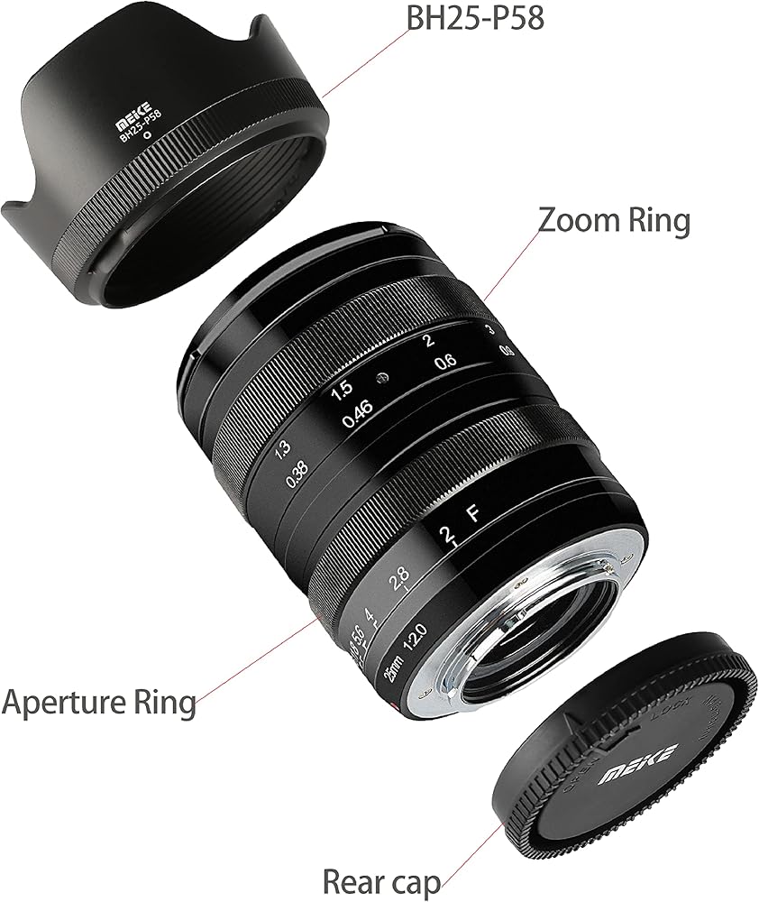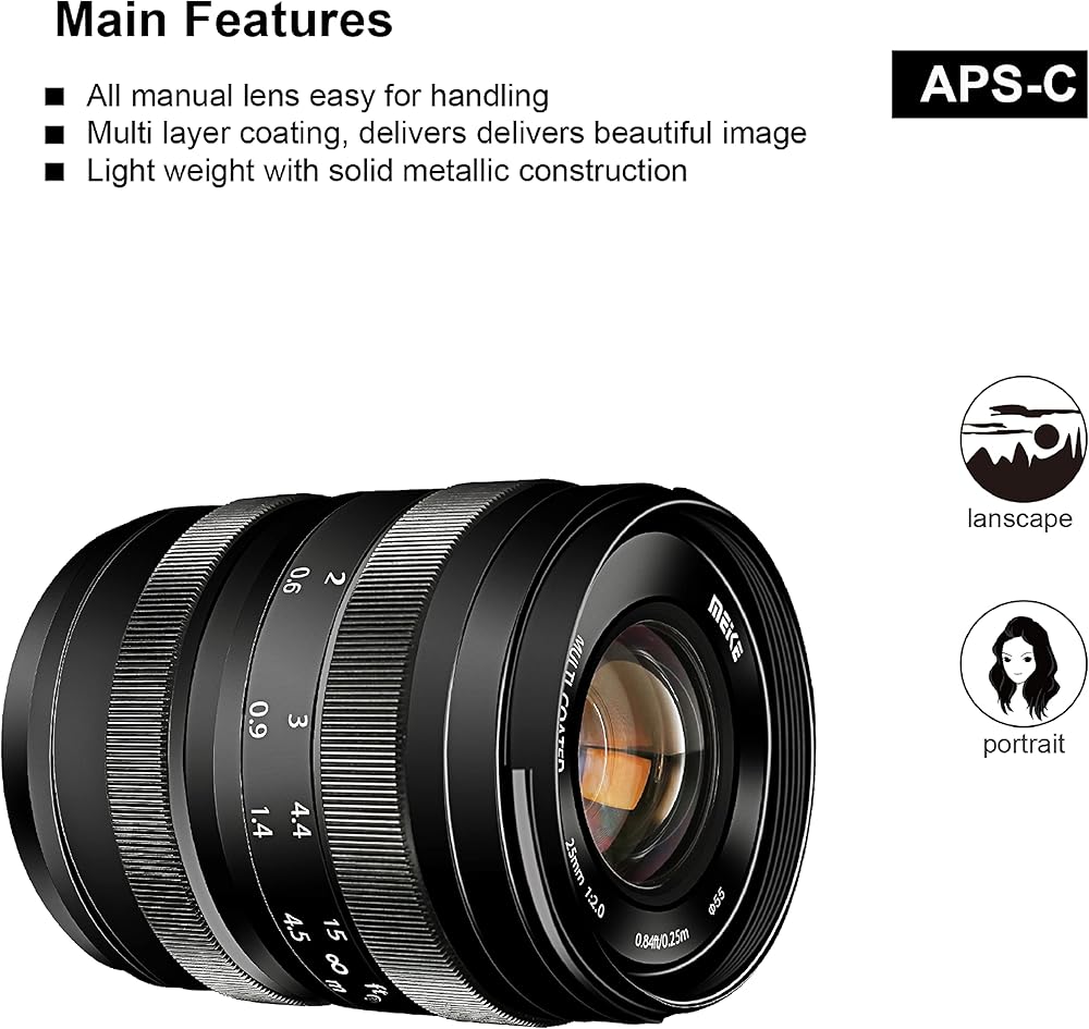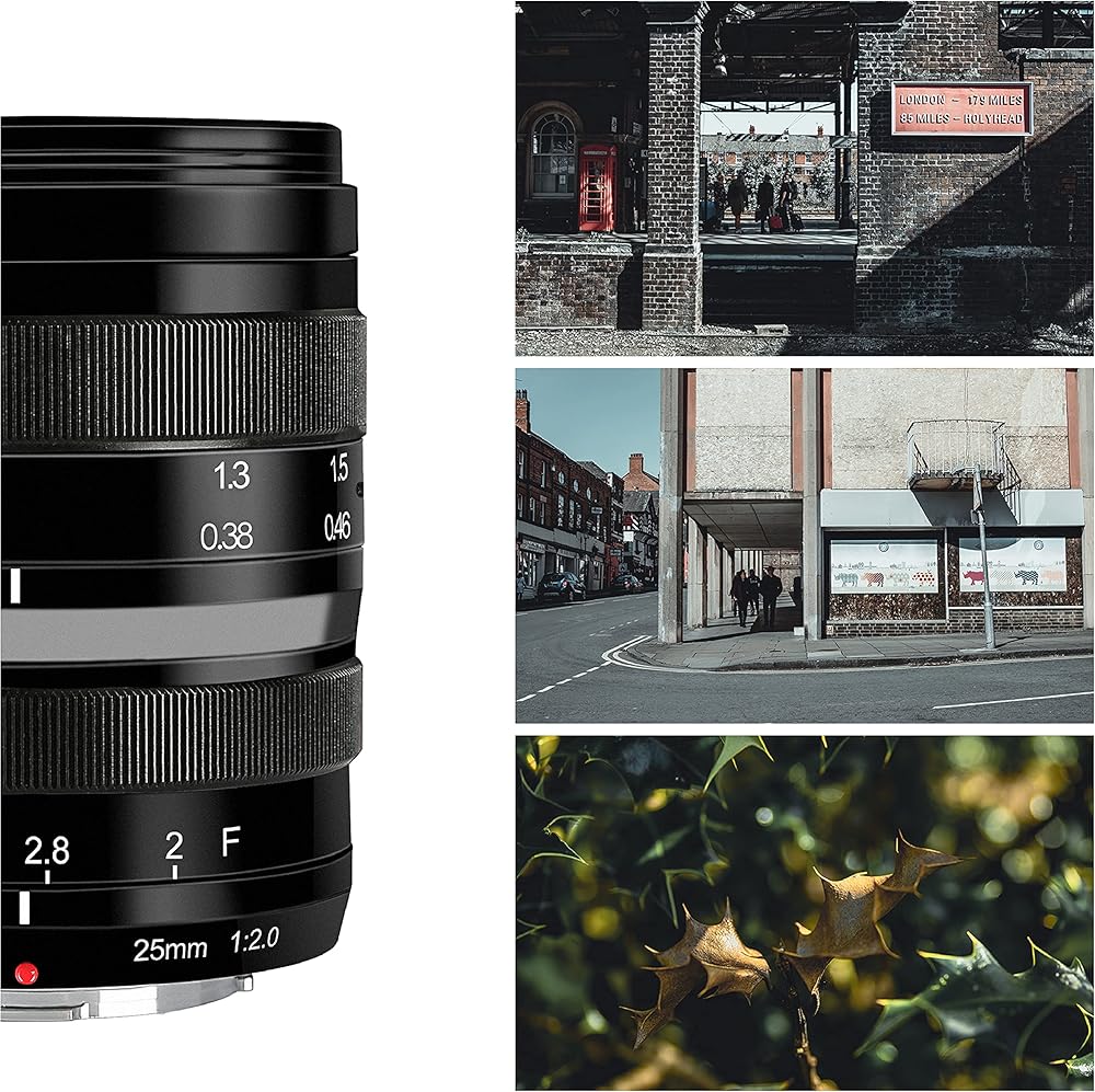 البعد البؤري الثابت 25 ملم، عدسة بزاوية واسعة. أقصى فتحة للعدسة 2.0-16 توفر خوخًا سلسًا وحادًا ورائعًا للمناظر الطبيعية والتصوير الفلكي والتصوير الفوتوغرافي عن قرب