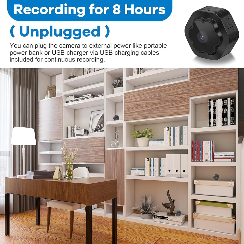 【كاميرا صغيرة بعمر بطارية 8 ساعات 】كاميرا الأمان الصغيرة هذه مع بطارية قابلة لإعادة الشحن عالية الجودة بقدرة 1000 مللي أمبير في الساعة، يمكن أن تستخدم حوالي 8 ساعات. بدون الوصول إلى الإنترنت، يمكنك أيضًا استخدام وضع عمل نقطة الاتصال الخاصة بالكاميرا الصغيرة اللاسلكية للعرض على مسافة قصيرة.