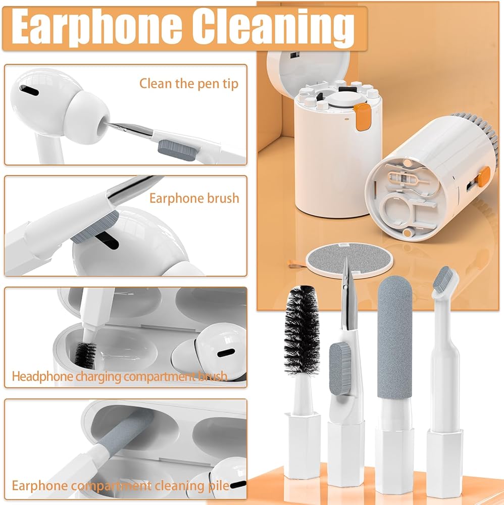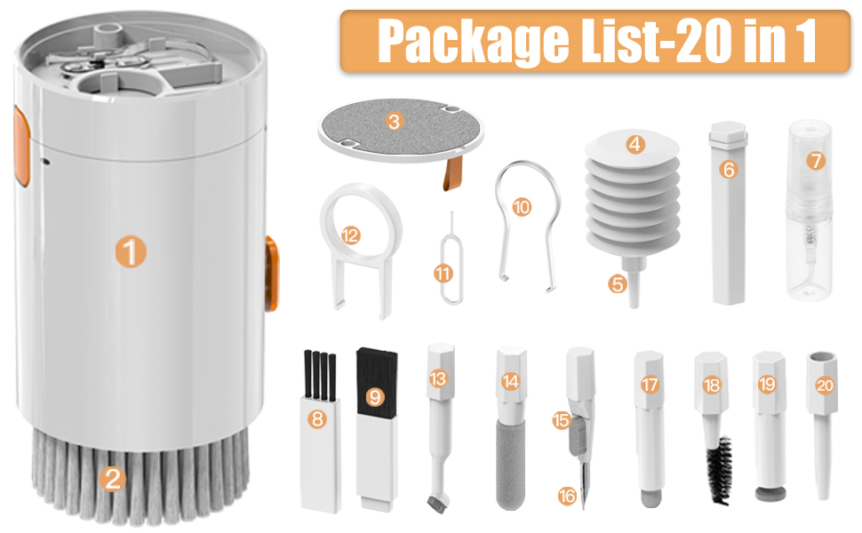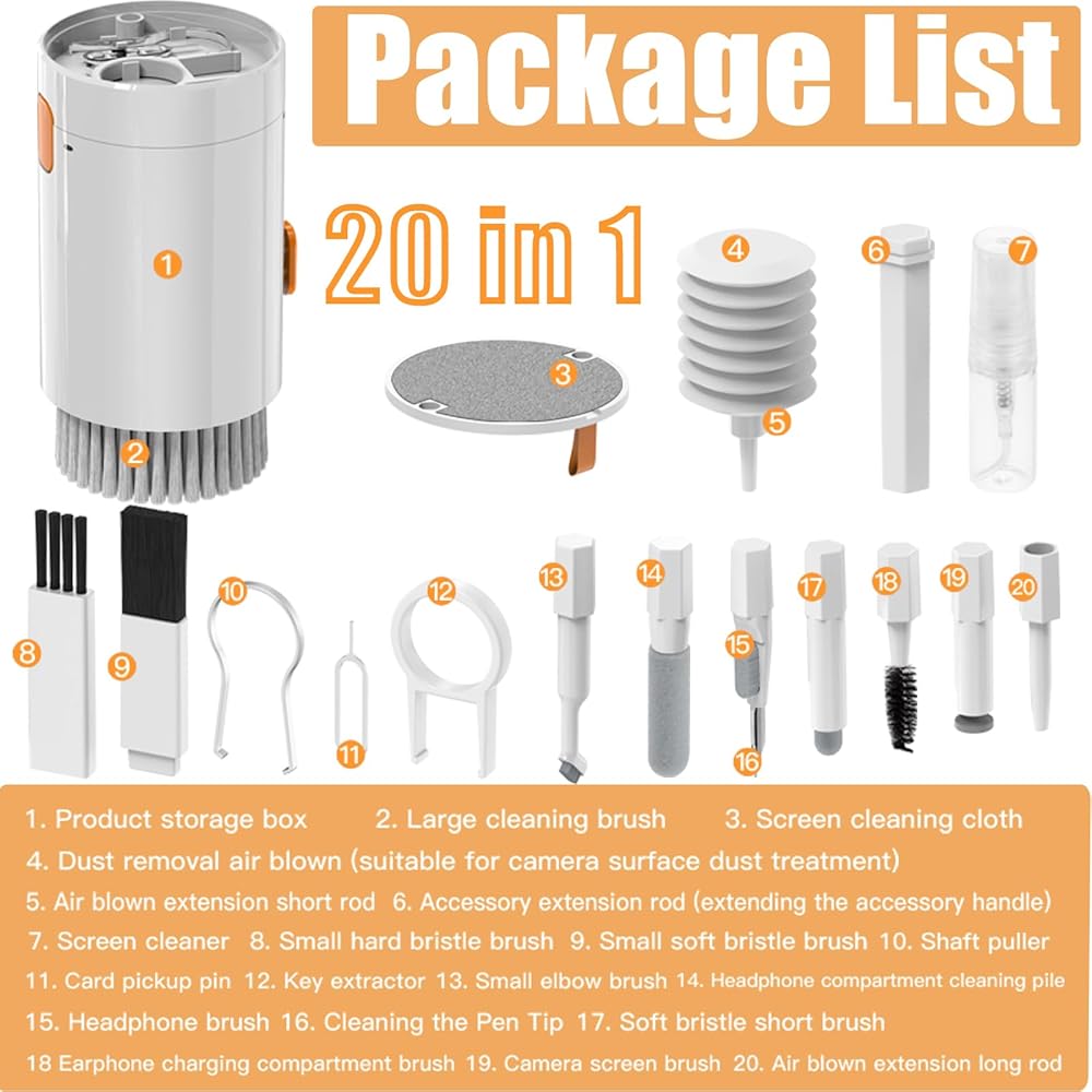 🎧مجموعة تنظيف لوحة المفاتيح الاحترافية - تعمل مجموعة التنظيف الإلكترونية على التنظيف العميق لجميع أجهزتك الإلكترونية مثل الهواتف المحمولة وسماعات الرأس وما إلى ذلك. تشتمل مجموعة تنظيف الهاتف 20 في 1 على: حقيبة تخزين، فرشاة تنظيف كبيرة، فرشاة تنظيف صغيرة*6، قطعة قماش للتنظيف، مجفف شعر، وصلة مجفف شعر 2، ملحقات ملحقة، ساحب عمود، دبابيس، مستخرج لوحة المفاتيح، كومة تنظيف سماعة الرأس، سنون التنظيف، فرشاة طلاء شاشة الكاميرا.