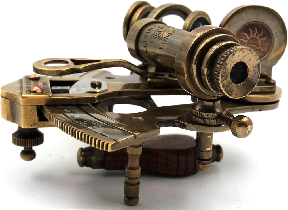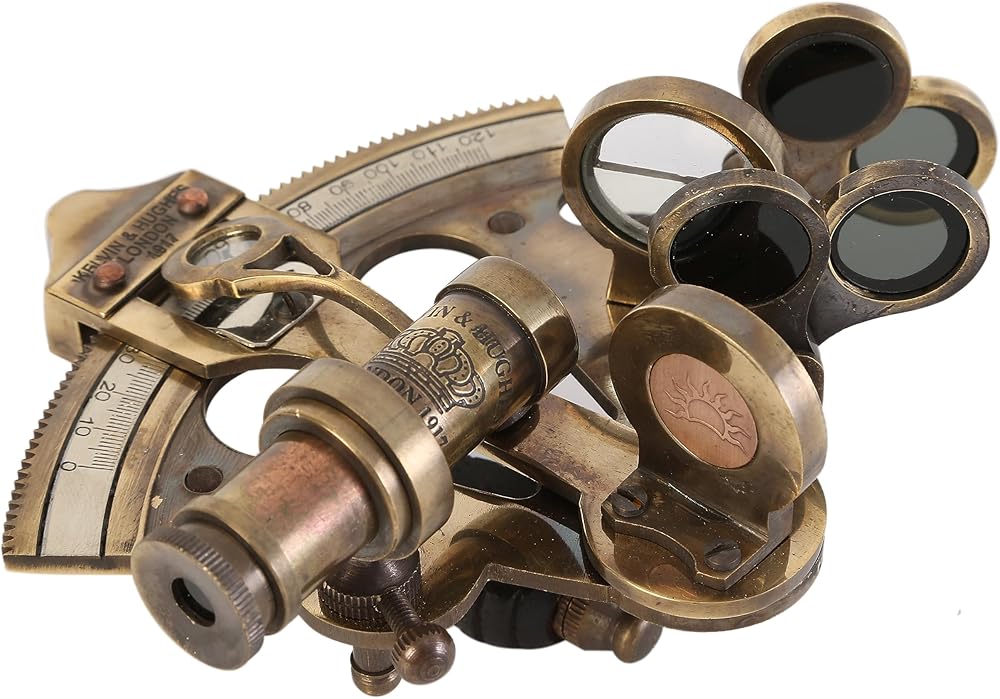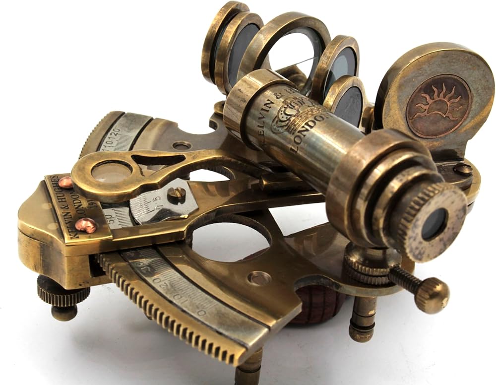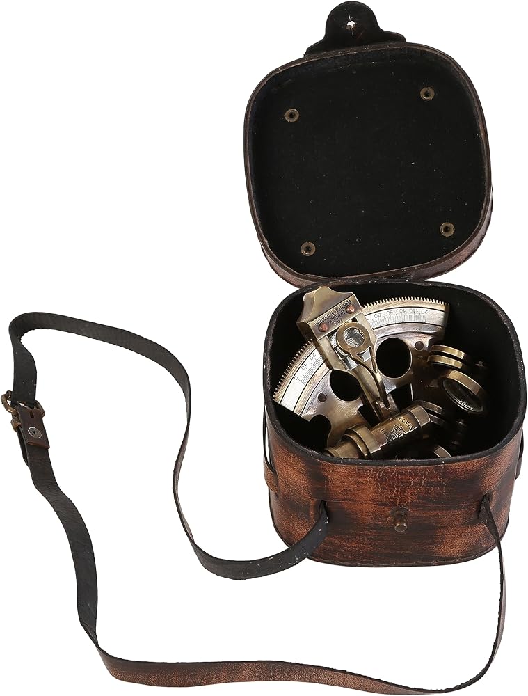 Antique Reproduction of 3 inch sextant with chart on leather box. Size:- 9.5cm - L x 9.5cm - W x 6.5cm - H (Sextant) Size:- 12cm - L x12cm - W x 6.5cm - H (Leather Box) Weight Approx :- 500 gms