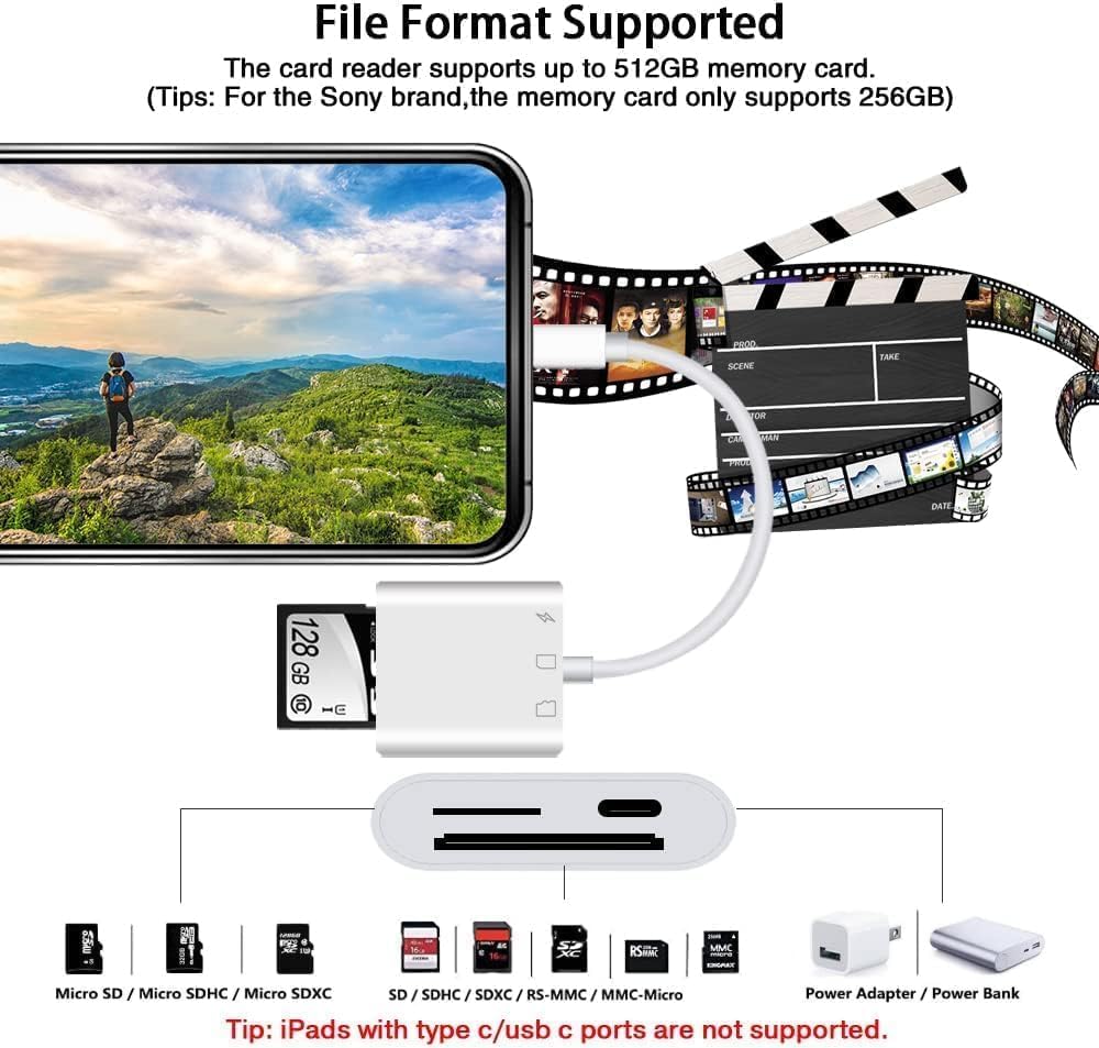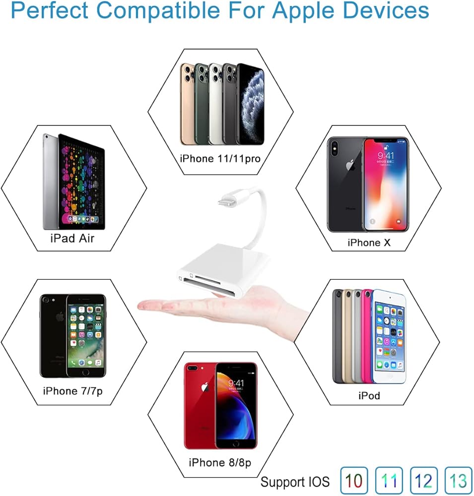 يتوافق هذا المحول مع أجهزة مختلفة، بما في ذلك iPhone 14 Pro Max/14 Pro/14 Plus/13//12/11 Pro Max/11 Pro/11/XS Max/XS/XR/X/8/8 Plus/7/ 7 Plus/6S/6S Plus/5/5S/SE وiPad Pro/Air/Mini/iPod touch (ضمن المجلد: DCIM). تستطيع الطرز التي تعمل بنظام التشغيل iOS 13 والإصدارات الأحدث قراءة مقاطع فيديو بدقة 4K. يدعم المحول iOS 9.2 إلى iOS 14 والإصدارات الأقدم، ولا يلزم وجود تطبيق إضافي للاستخدام.