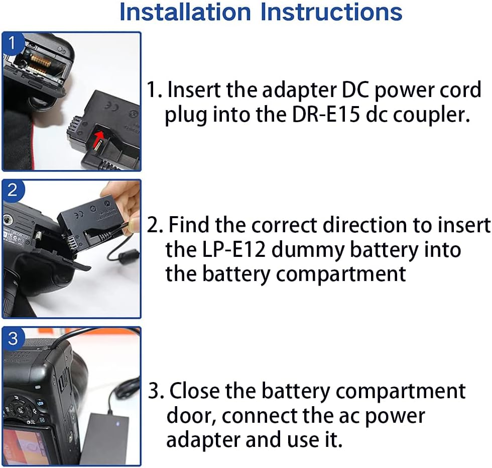 ◆ تحل مجموعة قارنة التوصيل DC DR-E15 محل مجموعات بطاريات Canon LP-E12، والتي يمكنها توفير مصدر طاقة مستمر للكاميرا. يمكنه تصوير وتسجيل مقاطع الفيديو لفترة طويلة، مما يحل مشاكلك التي تستبدل البطاريات والشحن بشكل متكرر.