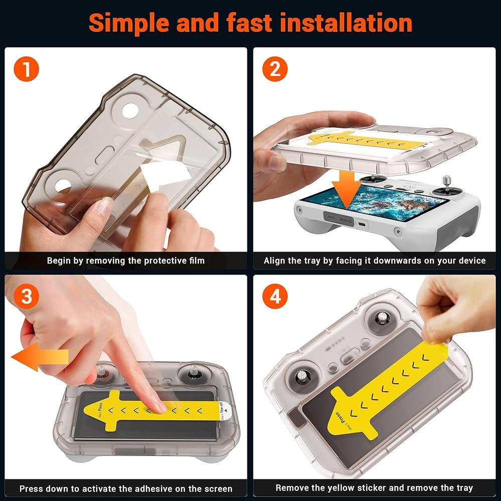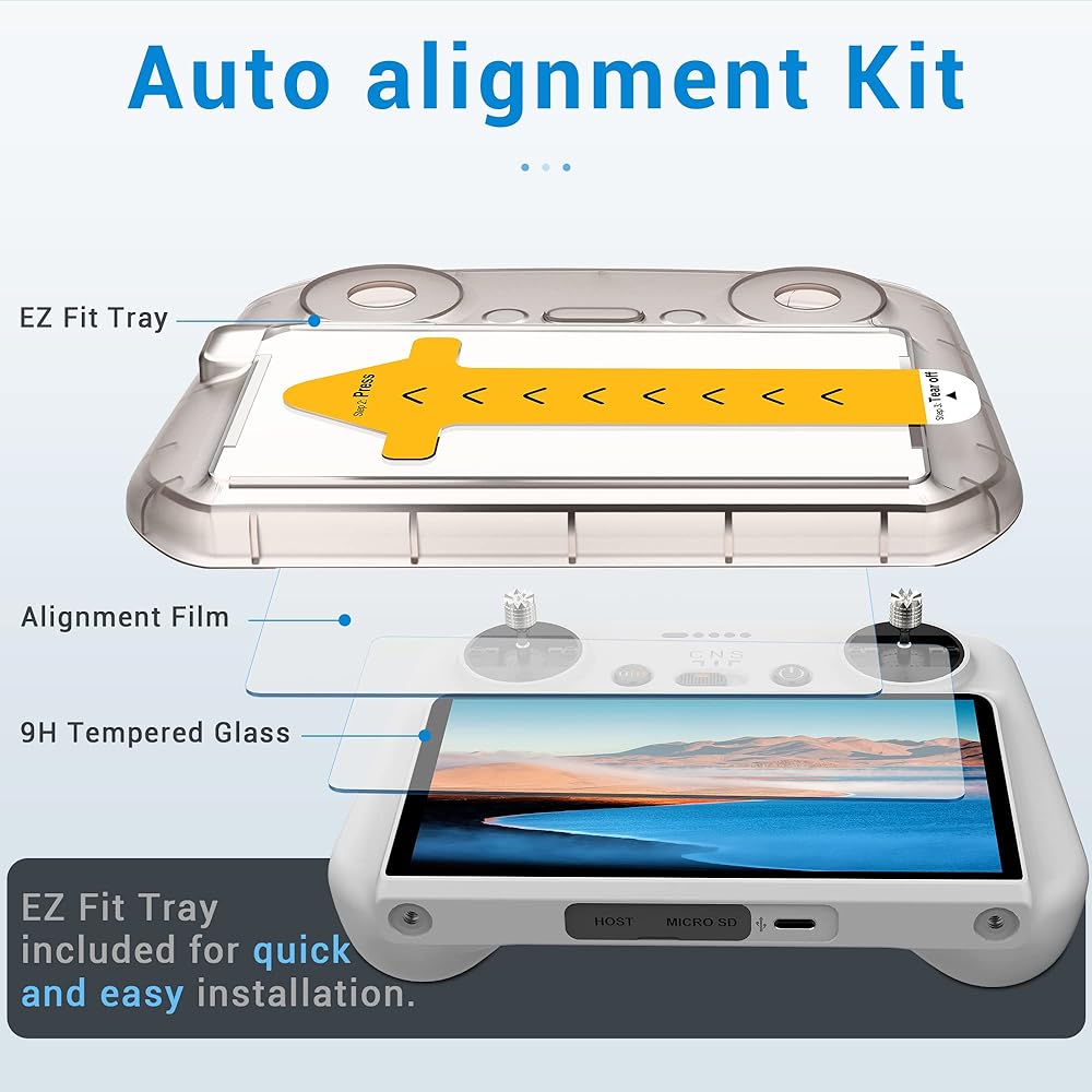 شاشة DJI RC ذات المحاذاة التلقائية: تركيب خالٍ من الفقاعات خلال 30 ثانية. ما عليك سوى تقشير الملصق من صينية أداة التوزيع المحملة مسبقًا، ثم قم بربطه بوحدة التحكم DJI RC الخاصة بك، ثم اضغط بقوة.