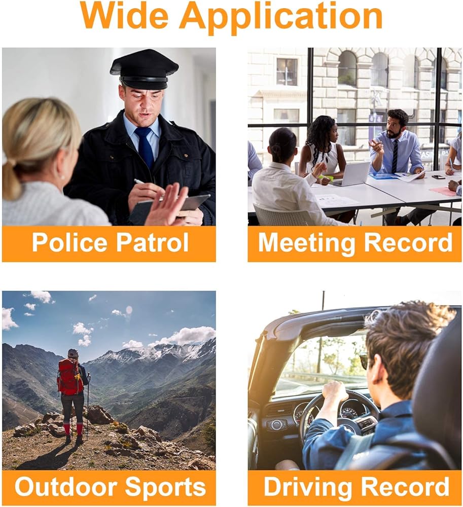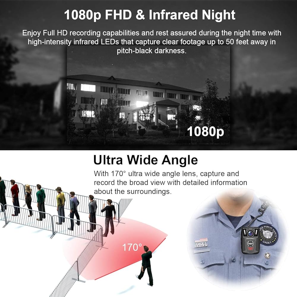 مساحة تخزين كبيرة مدمجة 64 جيجابايت وتسجيل متواصل - مساحة تخزين مدمجة 64 جيجابايت لجميع تسجيلات الفيديو والصور والصوت. سيكون هناك مساحة كبيرة لتخزين جميع مقاطع الفيديو التي تم التقاطها طوال أيام العمل القادمة. عندما يتم الوصول إلى حد التخزين في الذاكرة، تقوم كاميرا الجسم الخاصة بنا تلقائيًا بالكتابة فوق أقدم التسجيلات وتدور اللقطات الجديدة. لا يمكن نقل جميع مقاطع الفيديو والصور والصوت ومشاركتها إلا مع الأجهزة وأجهزة الكمبيوتر الأخرى عبر كيبل USB المرفق.