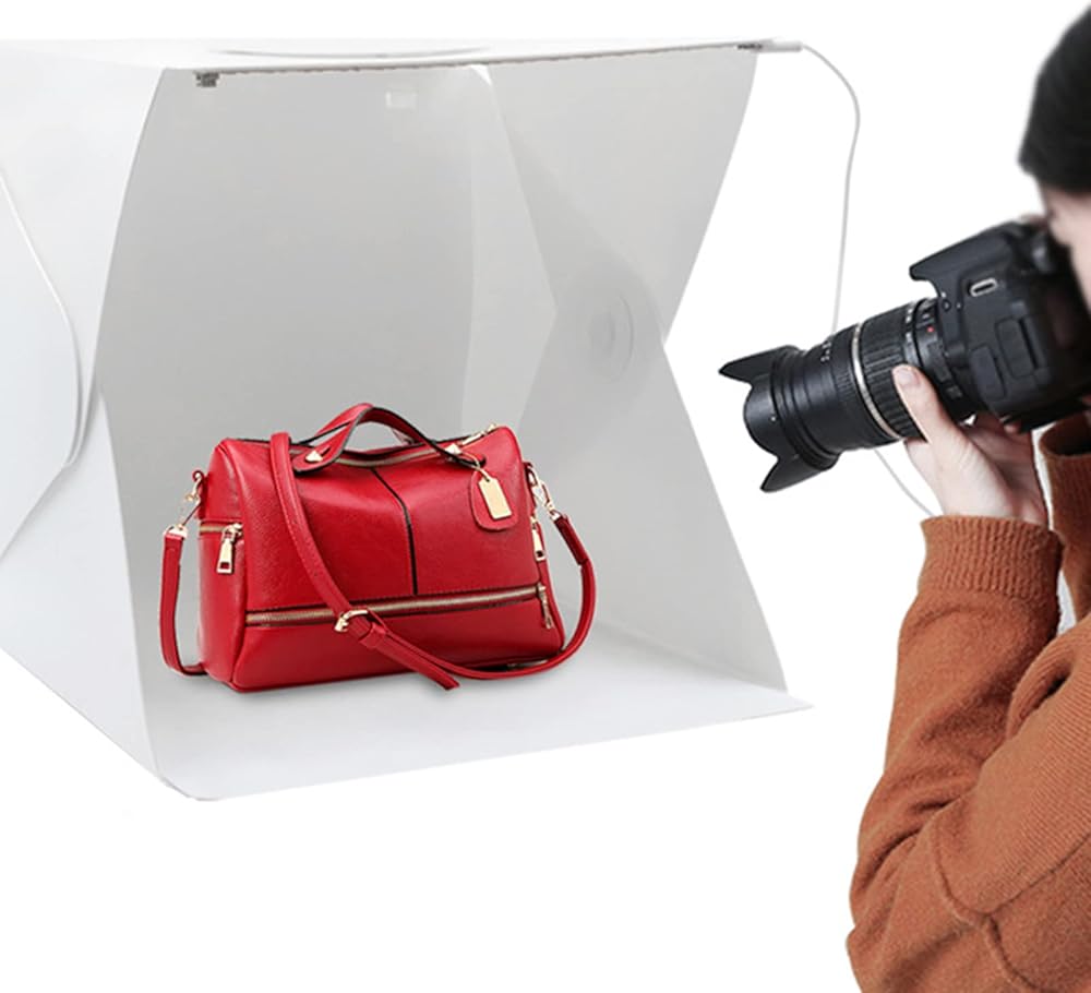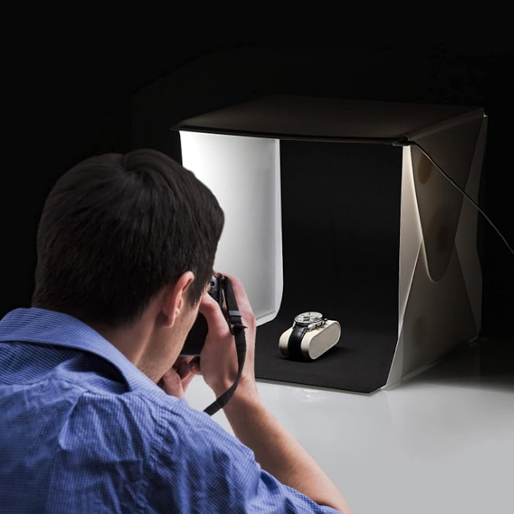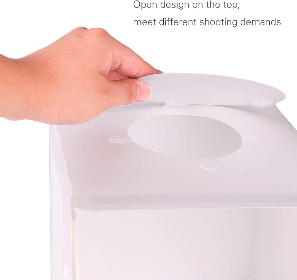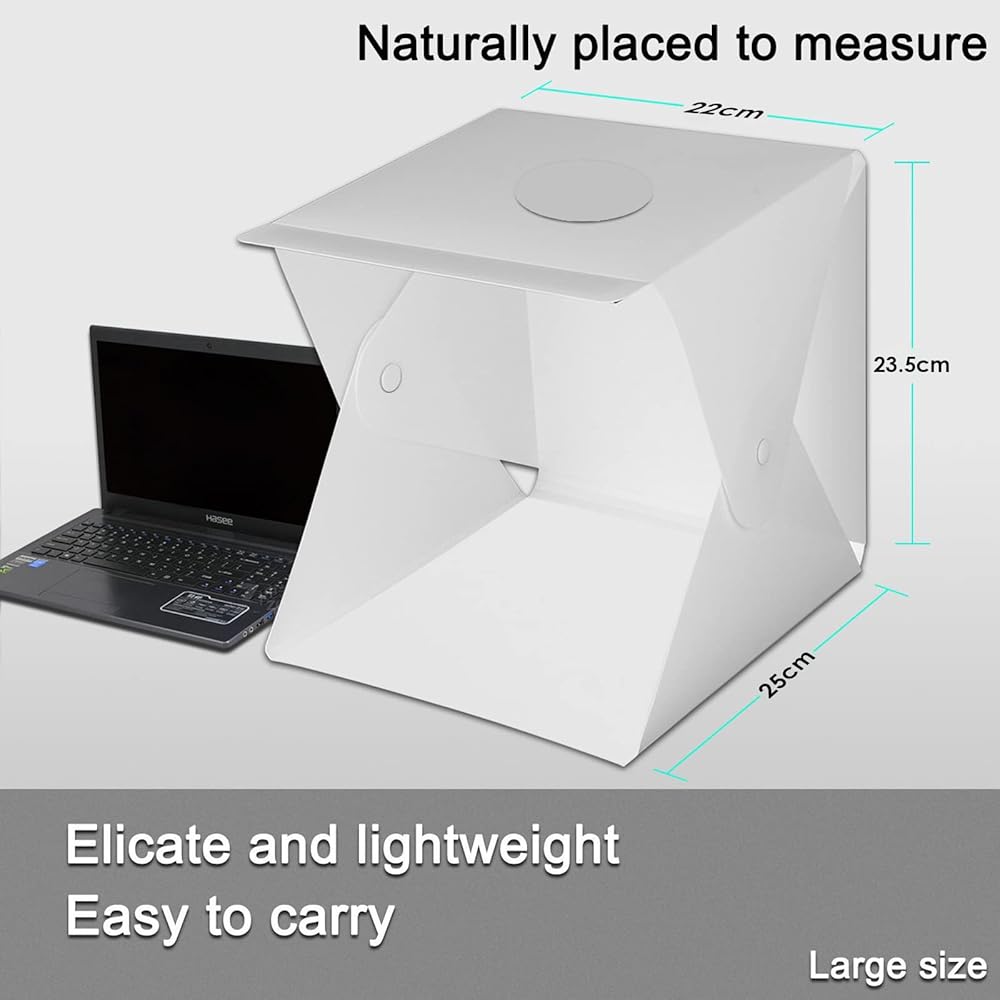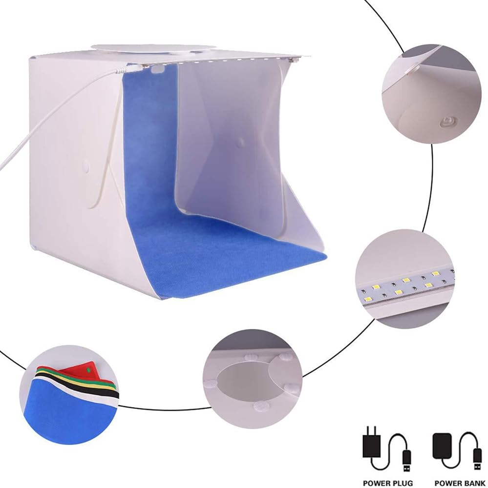 المقاس: المقاسات 8.9 × 9.1 × 9.4 مع 6 خلفيات ملونة. مثالية لتصوير الأشياء الصغيرة مثل المجوهرات والساعات وحرف فنجان الشاي وما إلى ذلك.