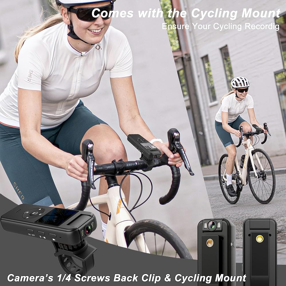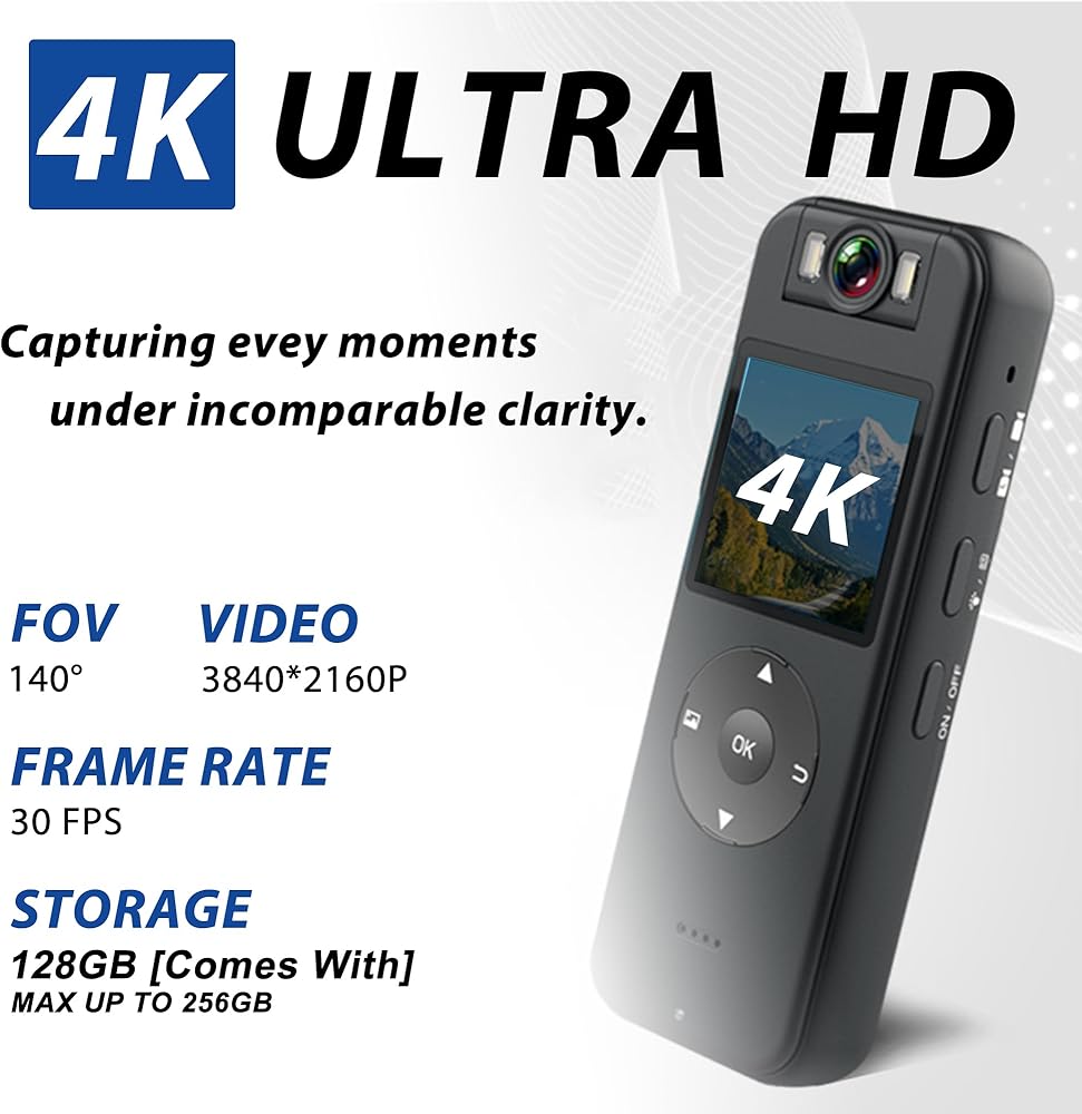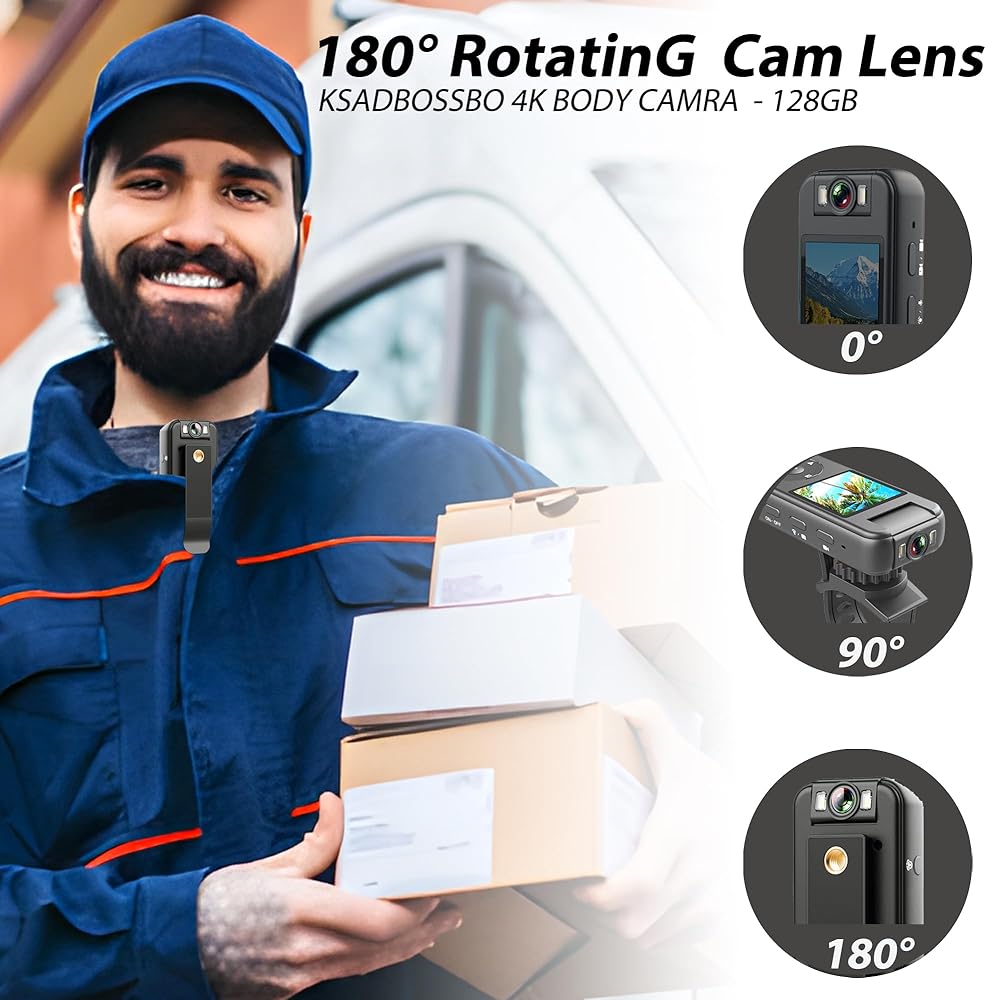 KSADBOSSBO كاميرا الجسم 128 جيجابايت مع تسجيل 4K 30FPS UHD 1.4 بوصة، كاميرا للجسم مع مشبك دراجة، وضع مصباح يدوي، عمر بطارية 6 ساعات كاميرا شرطة يمكن ارتداؤها للمنزل، في الهواء الطلق، إنفاذ القانون، حارس الأمن