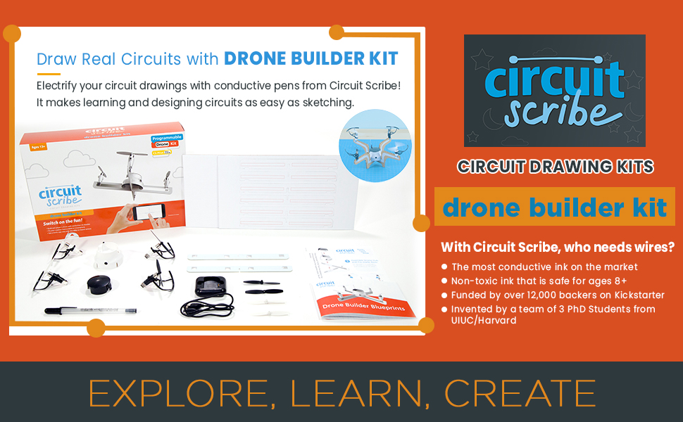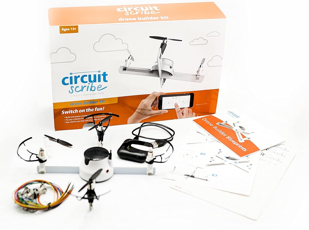 • استكشف الفن والإبداع بينما تتعلم عن الإلكترونيات مع مجموعة الطائرات بدون طيار سيركويت سكرايب قم ببناء الطائرة بدون طيار الخاصة بك وتحليقها بسهولة مع تعليمات واضحة. لا يحتاج إلى لحام.