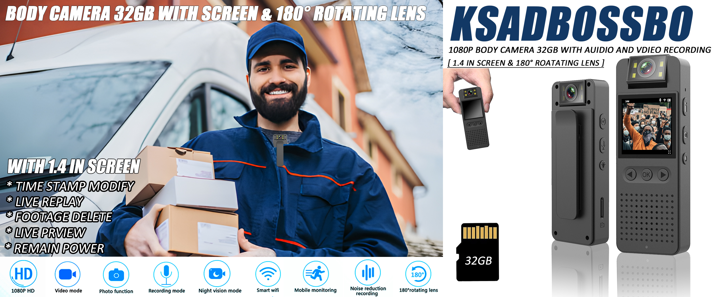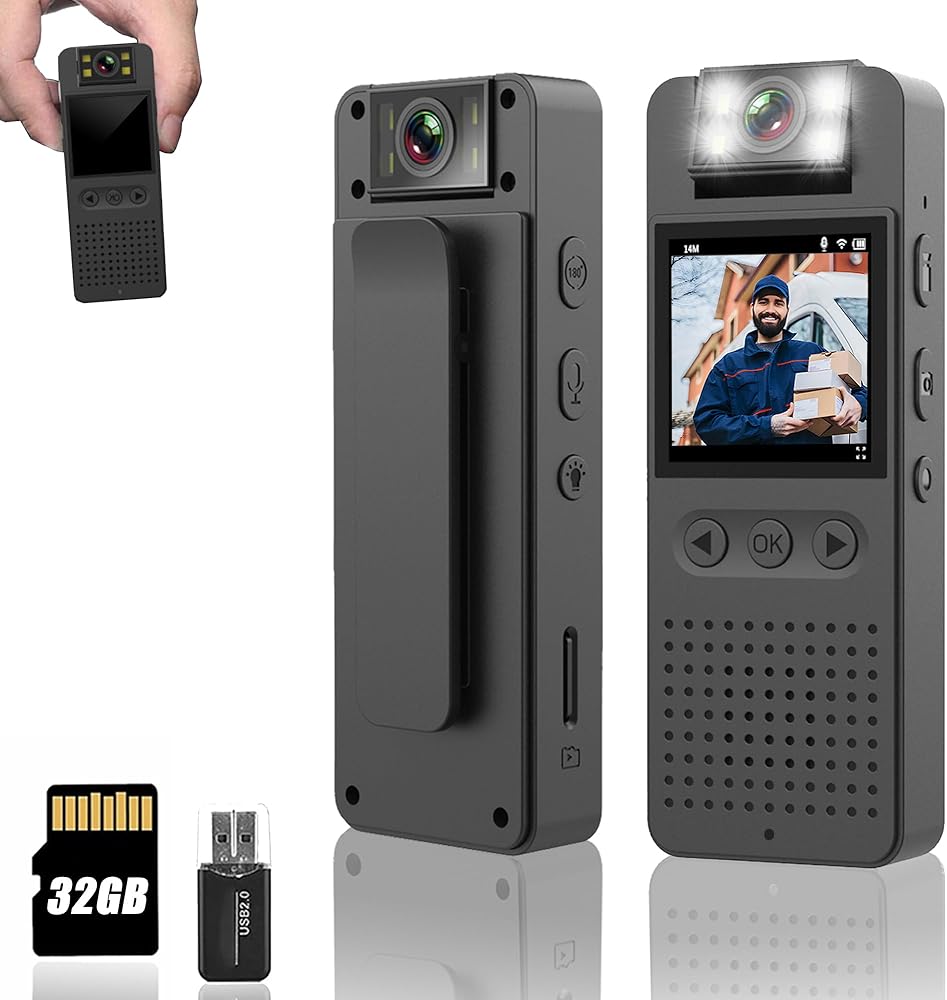 كاميرا الجسم مع تسجيل 1080 بكسل، شاشة 1.4 بوصة ومسجل عدسة دوارة 180 درجة، بطاقة مدمجة سعة 32 جيجابايت، وضع المصباح اليدوي، عمر بطارية 7 ساعات، كاميرا شرطة يمكن ارتداؤها للمنزل/الخارج/إنفاذ القانون/حارس الأمن