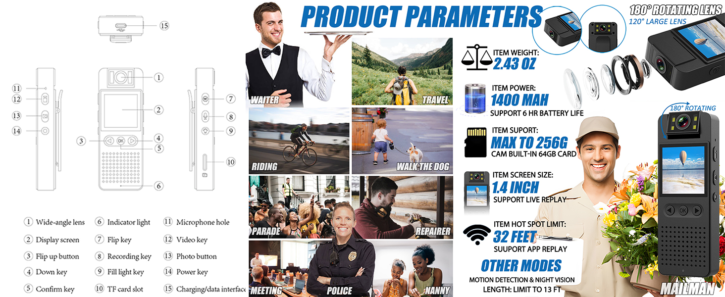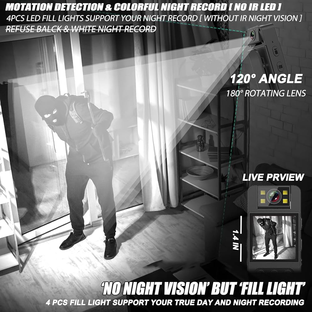 【قابلة للدوران 180 درجة - عدسة 120 درجة وكشف الحركة / وضع المصباح الكاشف 】 كاميرا الجسم مع عدسة قابلة للدوران 180 درجة / 120 درجة يمكنها ضبط اتجاه العدسة حسب طلبك، مما يضمن عدم تسجيل الكاميرا بزاوية خاطئة، وتفويت المهم. شهادة. يمكن أن يساعدك اكتشاف الحركة على توفير المزيد من الطاقة ومساحة الذاكرة عندما لا تحتاج إلى التسجيل طوال الوقت. بغض النظر عن المكان والنهار/الليل، يمكن لمصابيح ملء الكاميرا المكونة من 4 قطع أن تضيء أينما كنت، مما يوفر لك تسجيلًا ليليًا ملونًا تحت الضوء/بدون عدسات IR