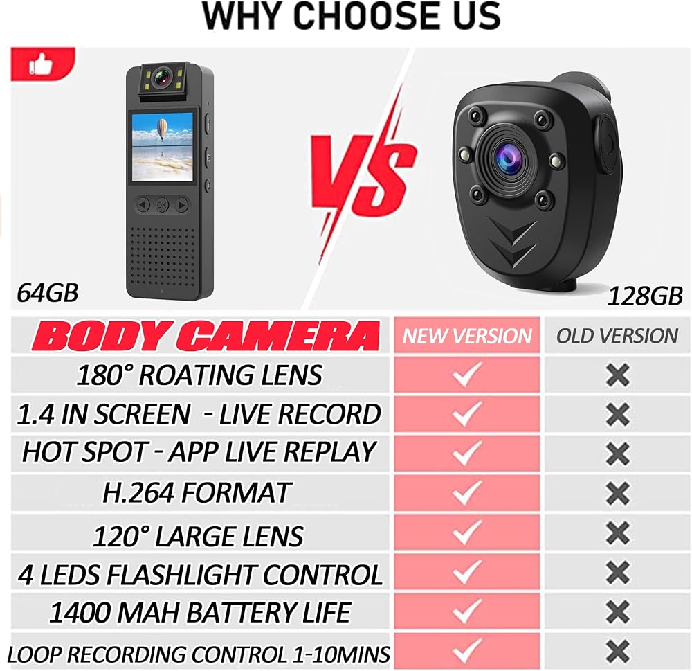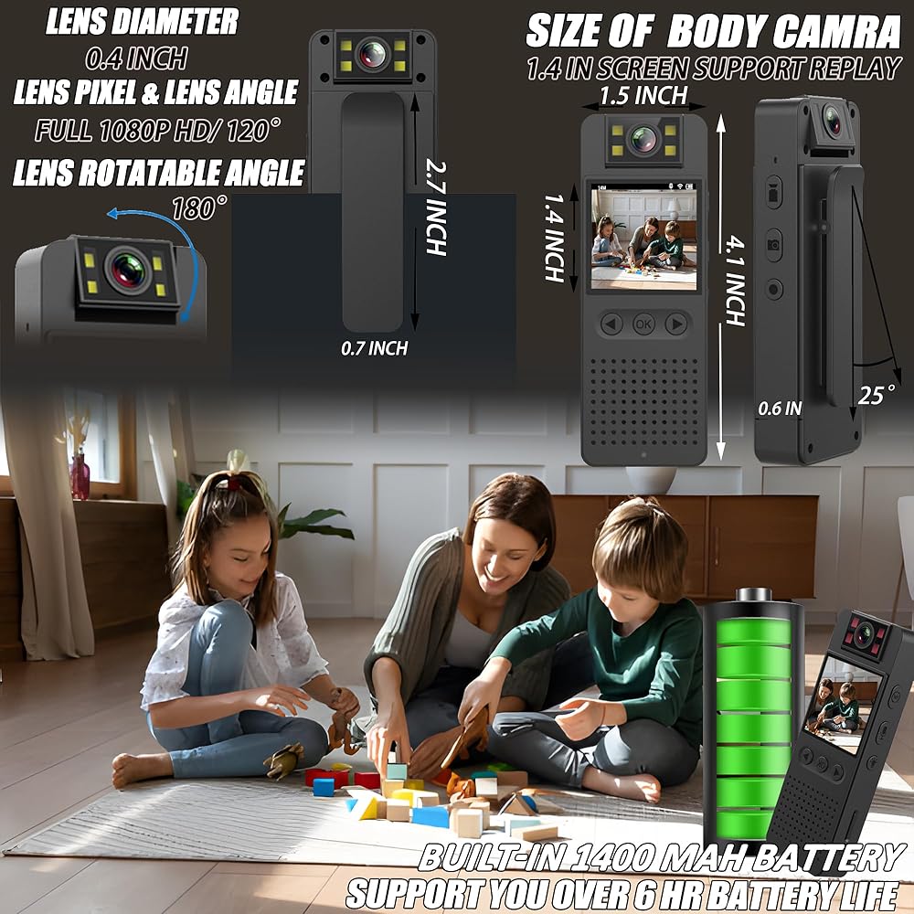 【عمر بطارية 7 ساعات/32 جيجابايت و3 طرق لإعادة التشغيل】كاميرا الجسم مزودة ببطارية قابلة لإعادة الشحن بقدرة 1400 مللي أمبير في الساعة، والتي يمكن أن تدوم ما يقرب من 6-7 ساعات عمل، كما تدعم تسجيل الفيديو على مدار الساعة طوال أيام الأسبوع عند توصيل بنك الطاقة/الطاقة. ، تساعدك على مراقبة كل مكان. ①تحتوي كاميرات الجسم لدينا على بطاقة مدمجة بسعة 32 جيجابايت، لدعم حفظ التسجيل لفترة طويلة ويتم التعرف عليها بواسطة الهواتف المحمولة/أجهزة الكمبيوتر المحمولة/الكمبيوتر الشخصي لإعادة التشغيل. ②وضع النقطة الساخنة للكاميرا يصل إلى 32 قدمًا، مع تطبيق لإعادة التشغيل. ③إعادة التشغيل على الشاشة.