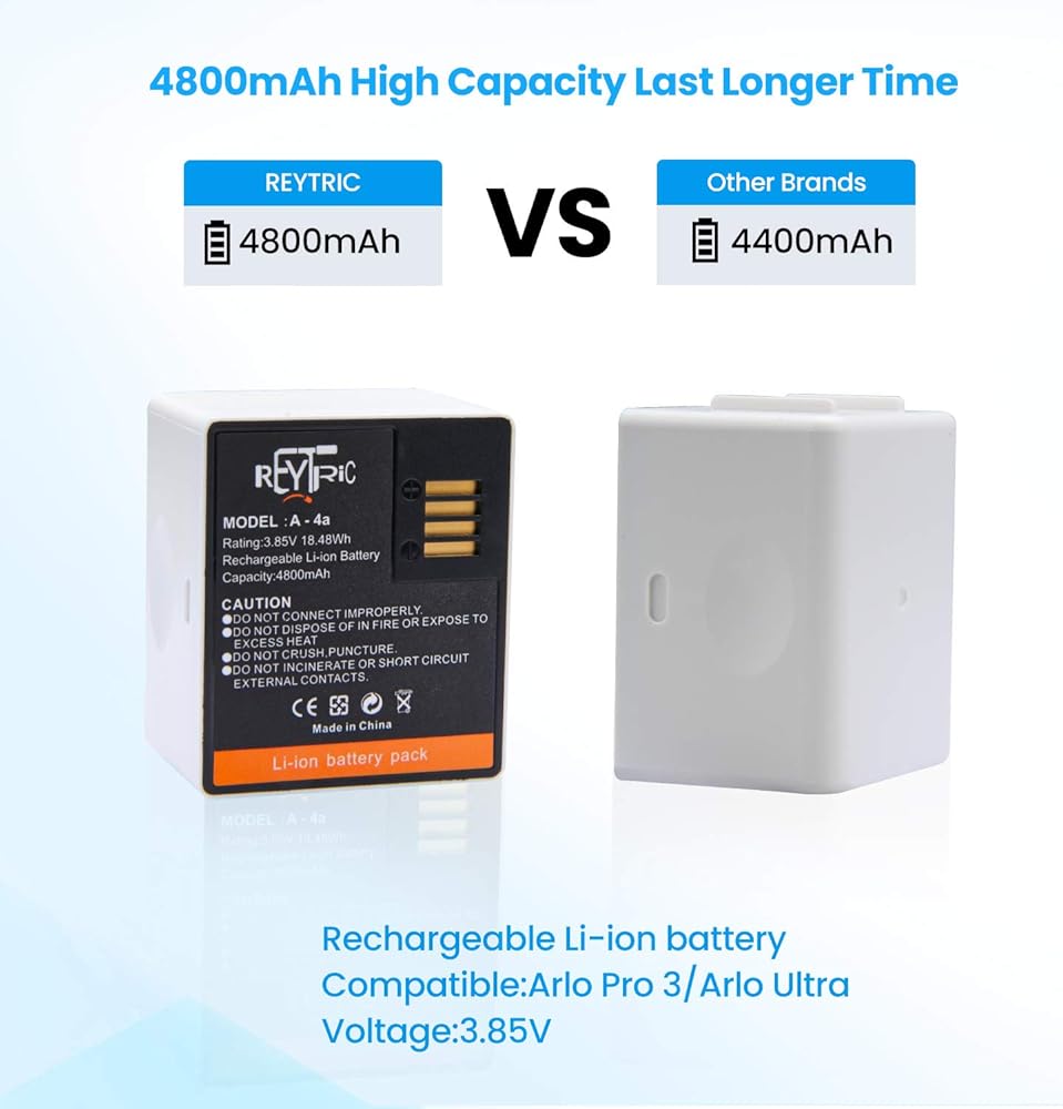 【نوع البطارية 】 المادة: ليثيوم أيون قابلة لإعادة الشحن؛ السعة: 3.85 فولت/4800 مللي أمبير/18.48 وات في الساعة؛ الخلايا عالية السعة والجودة تجعل أجهزة Arlo Pro 3 وPro 4 وArlo Ultra وUltra 2 تعمل لفترة أطول، وتوفر أداءً متواصلًا لأمن منزلك وتتيح لك تقليل وقت التوقف عن العمل.