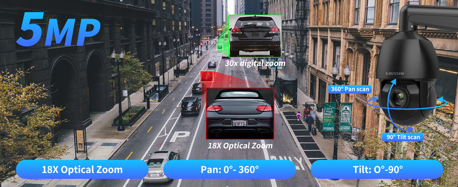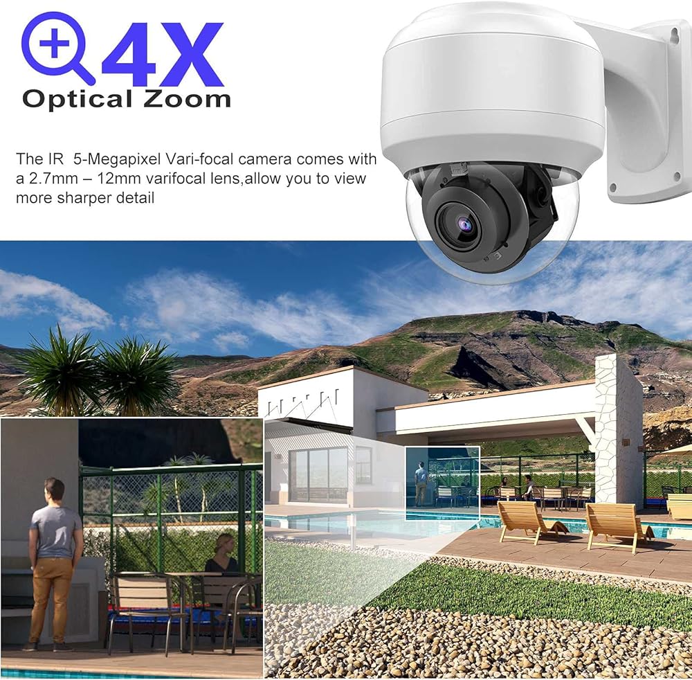 • UltraHD 4K PTZ 5XOptical Zoom: دقة 8MP@20fps 60@FPS(1920×1080) تتميز بأحدث 1/2.8" IMX415 CMOS، تأتي مع مصباحين دافئين و2 إضاءة LED بالأشعة تحت الحمراء يمكن التقاط صور واضحة في الإضاءة المنخفضة أو الظلام الدامس، مسافة رؤية ليلية طويلة للغاية تصل إلى 132 قدمًا؛ قبة عالية السرعة مع مقلاة من 0 إلى 275 درجة/إمالة من 0 إلى 90 درجة لتغطية نطاق رؤية أكبر بكثير، عدسة بمحرك 2.7-13.5 مم تمكنك من التكبير لرؤية المزيد من التفاصيل البعيدة الأشياء البعيدة دون الإضرار بجودة الصورة
