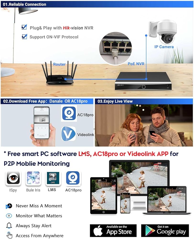 • متوافقة مع HIKVISION: كاميرا PTZ PoE IP الخارجية تسمح بـ PoE. تعمل وظيفة PoE على تبسيط عملية التثبيت، وتقليل تكاليف الكابلات، ويكون الاتصال أكثر استقرارًا. كاميرا PTZ الخارجية هذه قادرة على التوصيل والتشغيل مع Hikvision أو Uniview NVR. كما أنه يدعم بروتوكول Open Network Video Interface للاتصال بأجهزة NVR الأخرى، مثل Da-hua، والعمل مع Blue Iris وiSpy. (دعم للحصول على شاشة المراقبة من خلال RTSP، RTMP، وعادة ما تستخدم للبث المباشر)